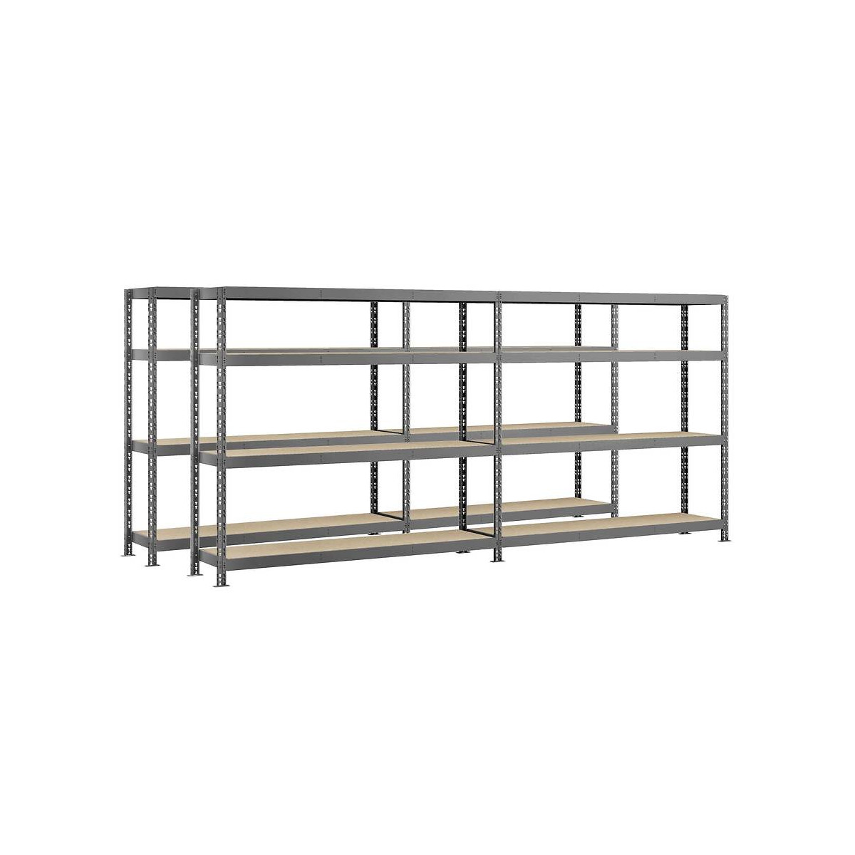 Lot de 2 étagères double Rack MODULOSTORAGE système extension de 290 cm, très grande longueur. Les + du produit Idéal pour optimiser l'espace au mur sur de grandes surfaces, Très fonctionnelle, elle permet d'optimiser le rangement de produits lourds ou encombrants, Modulable en hauteur grâce à ses plateaux amovibles, Enorme capacité de charge de 6400 kg, répartie jusqu'à 400 kg par plateau, Grande résistance dans les endroits humides, grâce à sa structure en acier protégée par une peinture époxy gris foncé. Montage rapide, sans vis ni boulon grâce à sa conception innovante. Caractéristiques techniques (unitaire) Dimensions : 290 x 50 x H 192 cm Nombre de plateaux : 8, épaisseur 8mm Matière plateaux : Aggloméré Capacité de charge : 400 kg/plateau Matière structure : Acier, finition époxy Montage : clipsage (fixation au mur recommandée) Coloris : gris foncé/bois Garantie 5 ans