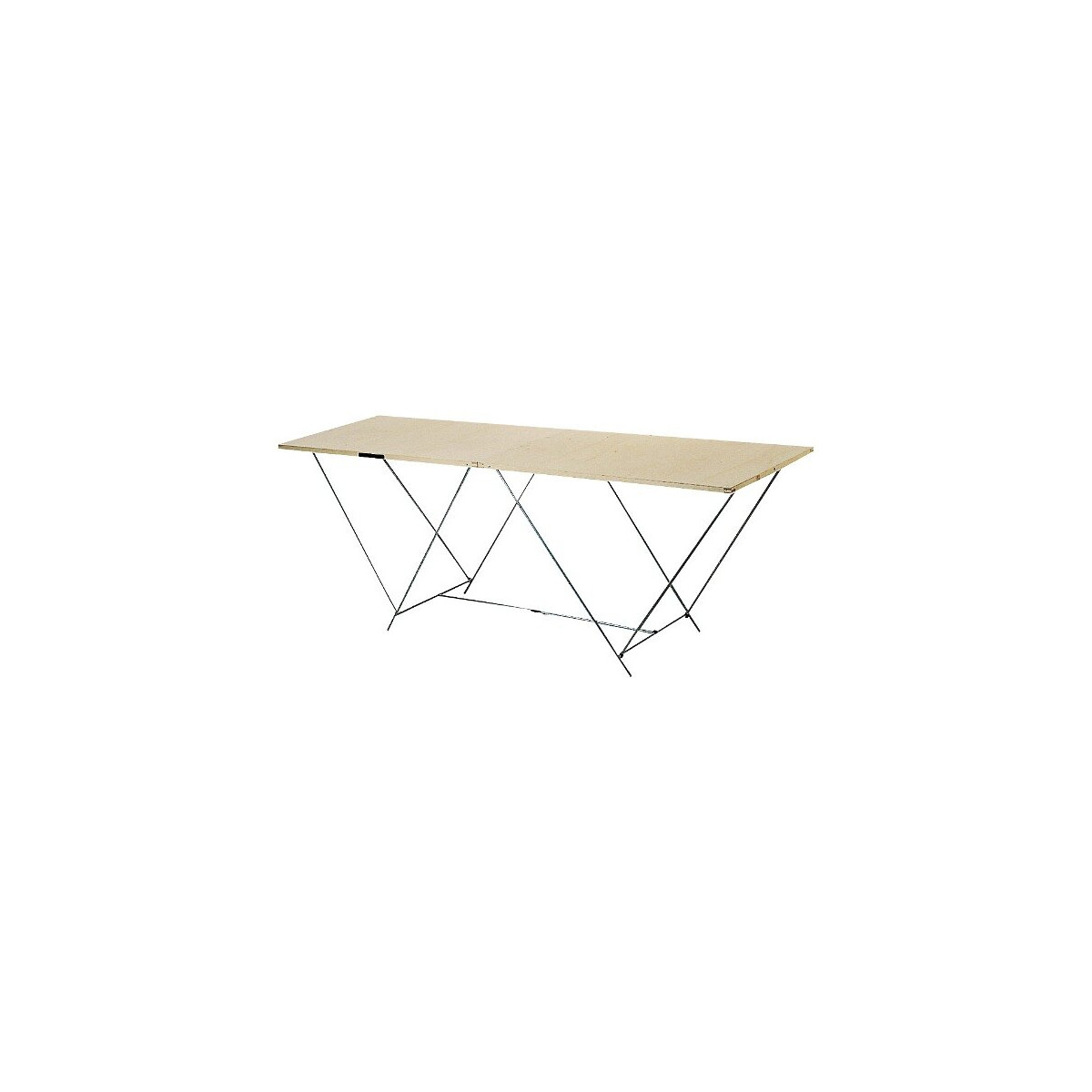 Table à tapisser standard. Plateau contreplaqué. Piètement en tube avec compas d'ouverture. Hauteur 73 cm. Avec graduation