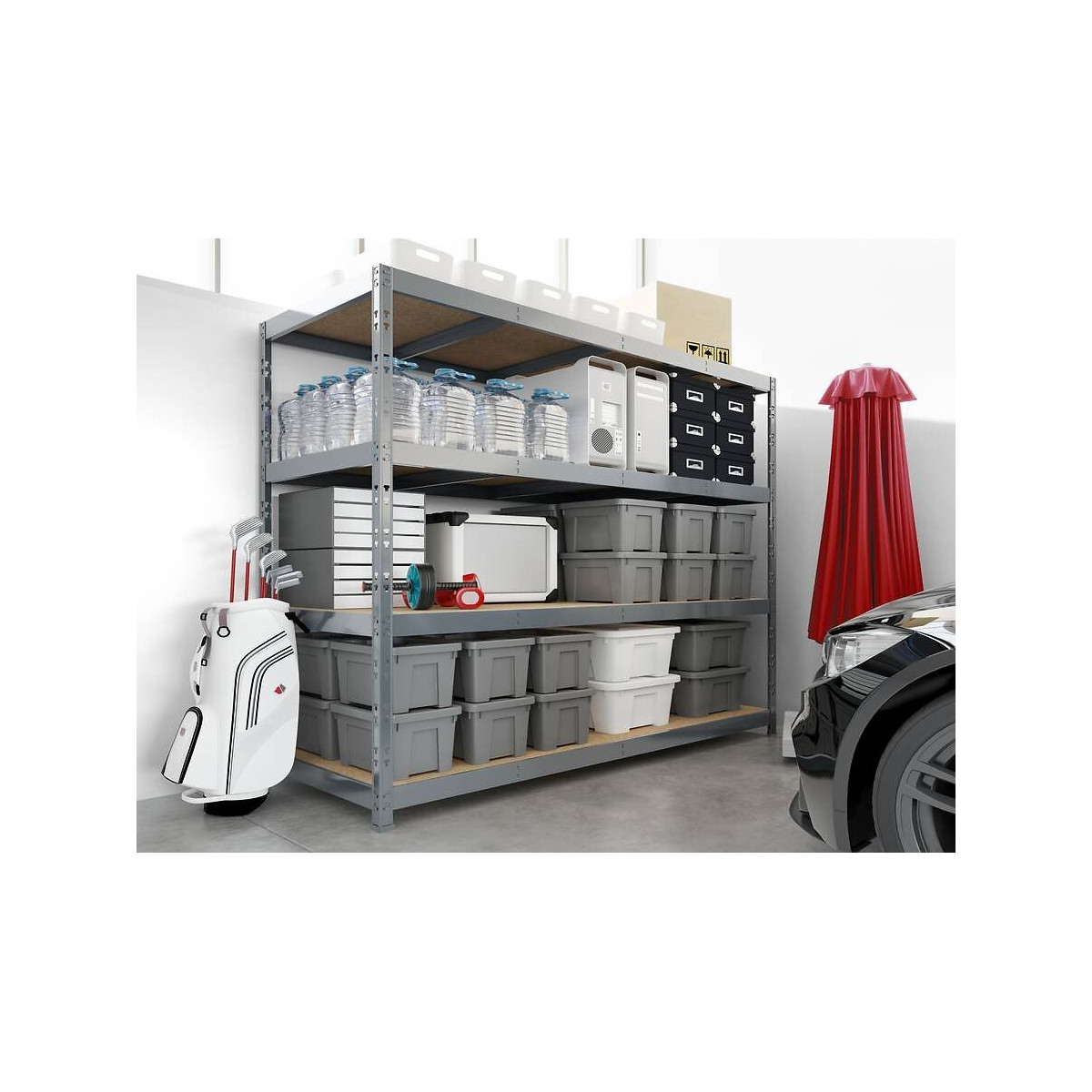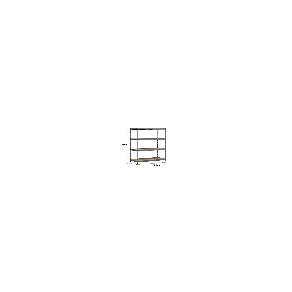 Etagère Rack MODULOSTORAGE charge très lourde de 200 x 80 cm, très grande profondeur. Les + du produit Idéal pour optimiser l'espace au mur sur de grandes surfaces, Très fonctionnelle, elle permet d'optimiser le rangement de produits lourds ou encombrants, Modulable en hauteur grâce à ses plateaux amovibles, Enorme capacité de charge de 2400 kg, répartie jusqu'à 600 kg par plateau, Grande résistance dans les endroits humides, grâce à sa structure en acier protégée par une peinture époxy gris foncé. Montage rapide, sans vis ni boulon grâce à sa conception innovante. Caractéristiques techniques Dimensions : 200 x 80 x H 200 cm Nombre de plateaux : 4, épaisseur 8mm Matière plateaux : Aggloméré Capacité de charge : 600 kg/plateau Matière structure : Acier, finition époxy Montage : clipsage (fixation au mur recommandée) Coloris : gris foncé/bois Garantie 5 ansSpécifications techniques