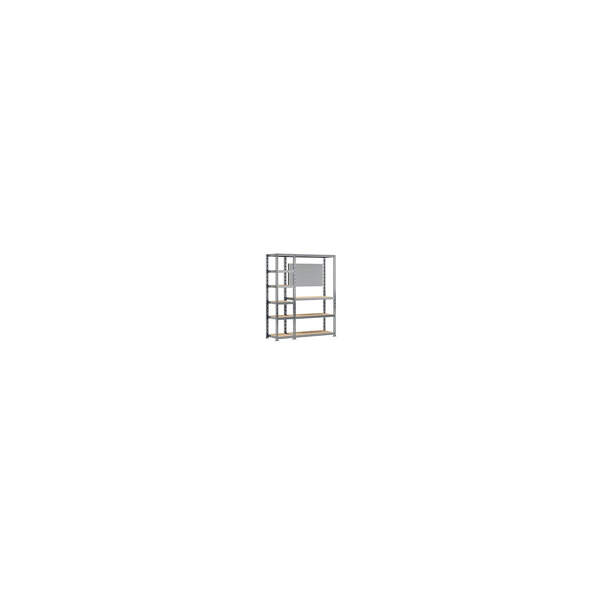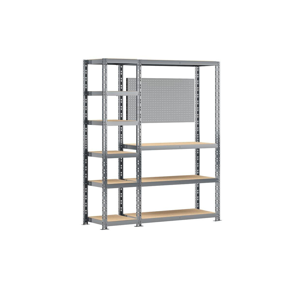 Etagère double charge lourde de 150 cm de long. Elle comprend une étagère de 6 plateaux 50 cm, une étagère établie de 4 plateaux 100 cm et un panneau porte outils. Utilisation double en rangement boites de conserves, bouteilles, chaussures, livres et petits produits et en établi de bricolage avec panneau support outils + étagère de rangement. Possibilité d'extension permanente avec toutes les extensions MODULÖ STORAGE. Les + du produit Idéal pour utiliser l'espace au mur, même sur de petites surfaces, Très fonctionnel, il permet d'optimiser le rangement des petits et moyens produits et réaliser des travaux de bricolage, Modulable en hauteur grâce à ses plateaux amovibles, Enorme capacité de charge de 2500 kg, répartie jusqu'à 250 kg par plateau, Grande résistance dans les endroits humides, grâce à sa structure en acier protégée par une peinture époxy gris foncé, Montage rapide, sans vis ni boulon grâce à sa conception innovante d'extension des 2 côtés. Caractéristiques techniques Dimensions hors tout : 150 x 40 x H 192 cm Nombre de plateaux : 10, épaisseur 8 mm Matière plateaux : Aggloméré Capacité de charge : 250 kg/plateau Matière structure : acier finition époxy Montage : Clipsage (fixation au mur recommandée) Coloris : Gris foncé/bois Garantie : 10 ans