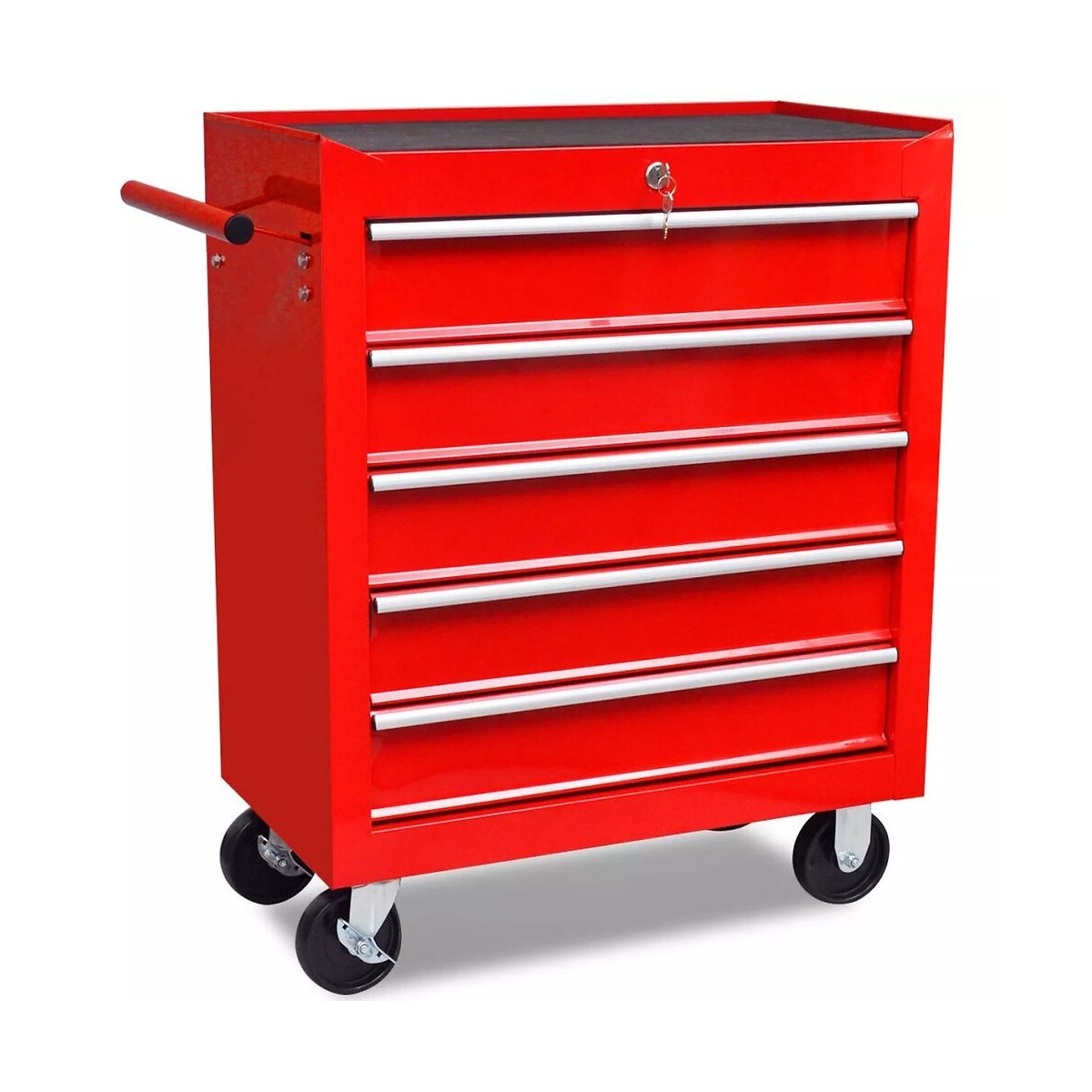 Utilisez ce chariot à outils de l'atelier pratique avec 5 tiroirs coulissants pour stocker et organiser vos outils. Chaque tiroir a une doublure de fond anti-dérapant pour maintenir vos outils en place. Grâce à la serrure intégrée, tous les tiroirs peuvent être verrouillés à la fois, qui les empêche d'ouvrir accidentellement lorsque le chariot se déplace. Deux des roulettes pivotantes ont des freins. Le plateau robuste de chariot à outils sera un endroit idéal pour garder à portée de main les outils fréquemment utilisés. Il y a également une poignée latérale pratique pour pousser le chariot à outils. Couleur: Rouge Matériau: Acier Dimensions totales (avec roues): 690 x 330 x 772 mm (L x l x H) Dimensions de tiroir: 510 x 290 x 100 mm (l x P x H) Avec 5 tiroirs coulissants Verrouillable Surface anti-rayures Structure robuste avec 4 roues pivotantes (2 d'entre eux avec freins)