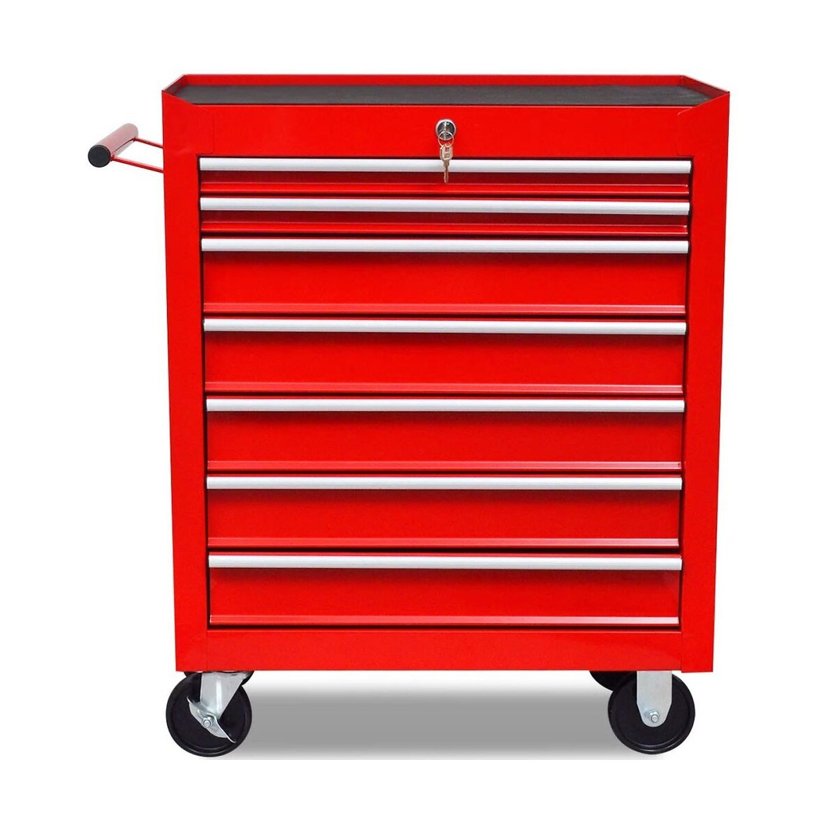 Utilisez ce chariot à outils de l'atelier pratique avec 7 tiroirs coulissants pour stocker et organiser vos outils. Chaque tiroir a une doublure de fond anti-dérapant pour maintenir vos outils en place. Grâce à la serrure intégrée, tous les tiroirs peuvent être verrouillés à la fois, qui les empêche d'ouvrir accidentellement lorsque le chariot se déplace. Deux des roulettes pivotantes ont des freins. Le plateau robuste de chariot à outils sera un endroit idéal pour garder à portée de main les outils fréquemment utilisés. Il y a également une poignée latérale pratique pour pousser le chariot à outils. Couleur: Rouge Matériau: Acier Dimensions totales (avec roues): 690 x 330 x 772 mm (L x l x H) Dimensions de tiroir 1: 510 x 290 x 40 mm (l x P x H) Dimensions de tiroir 2: 510 x 290 x 85 mm (l x P x H) Avec 7 tiroirs coulissants Verrouillable Surface anti-rayures Structure robuste avec 4 roues pivotantes (2 d'entre eux avec freins)