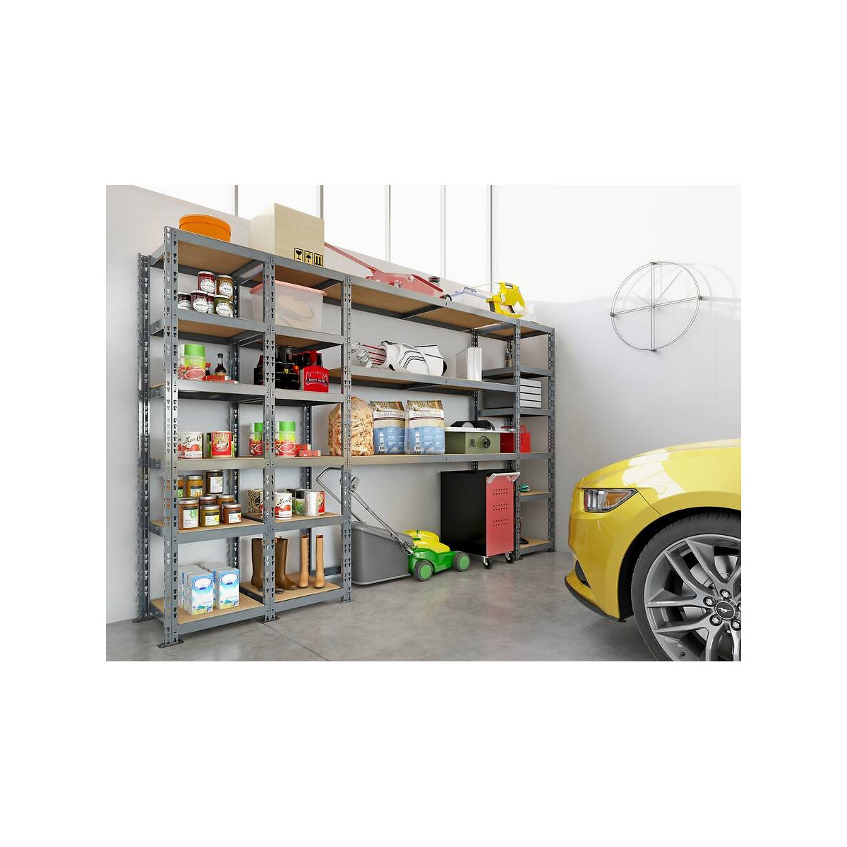 Etagère quadruple charge lourde de 300 cm de long. Elle comprend 3 étagères charge lourde de 6 plateaux 50 cm, une étagère rack de 3 plateaux 150 cm et des montants de renfort au sol anti-écartement. Utilisation concept rangement complet pour le garage permettant sur une longueur de 300 cm de ranger des petits produits comme les produits alimentaires, chaussures, livres, et des gros produits volumineux, des produits lourds. Possibilité d'extension permanente avec toutes les extensions MODULÖ STORAGE Les + du produit Idéal pour utiliser l'espace au mur, Très fonctionnel, il permet d'optimiser le rangement des produits petits, moyens, gros et volumineux, Modulable en hauteur grâce à ses plateaux amovibles, Enorme capacité de charge de 5250 kg, répartie jusqu'à 250 kg par plateau, Grande résistance dans les endroits humides, grâce à sa structure en acier protégée par une peinture époxy gris foncé, Montage rapide, sans vis ni boulon grâce à sa conception innovante d'extension des 2 côtés. Caractéristiques techniques Dimensions hors tout : 300 x 40 x H 192 cm Nombre de plateaux : 21, épaisseur 8 mm Matière plateaux : Aggloméré Capacité de charge : 250 kg/plateau Matière structure : acier finition époxy Montage : Clipsage (fixation au mur recommandée) Coloris : Gris foncé/bois Garantie : 10 ans