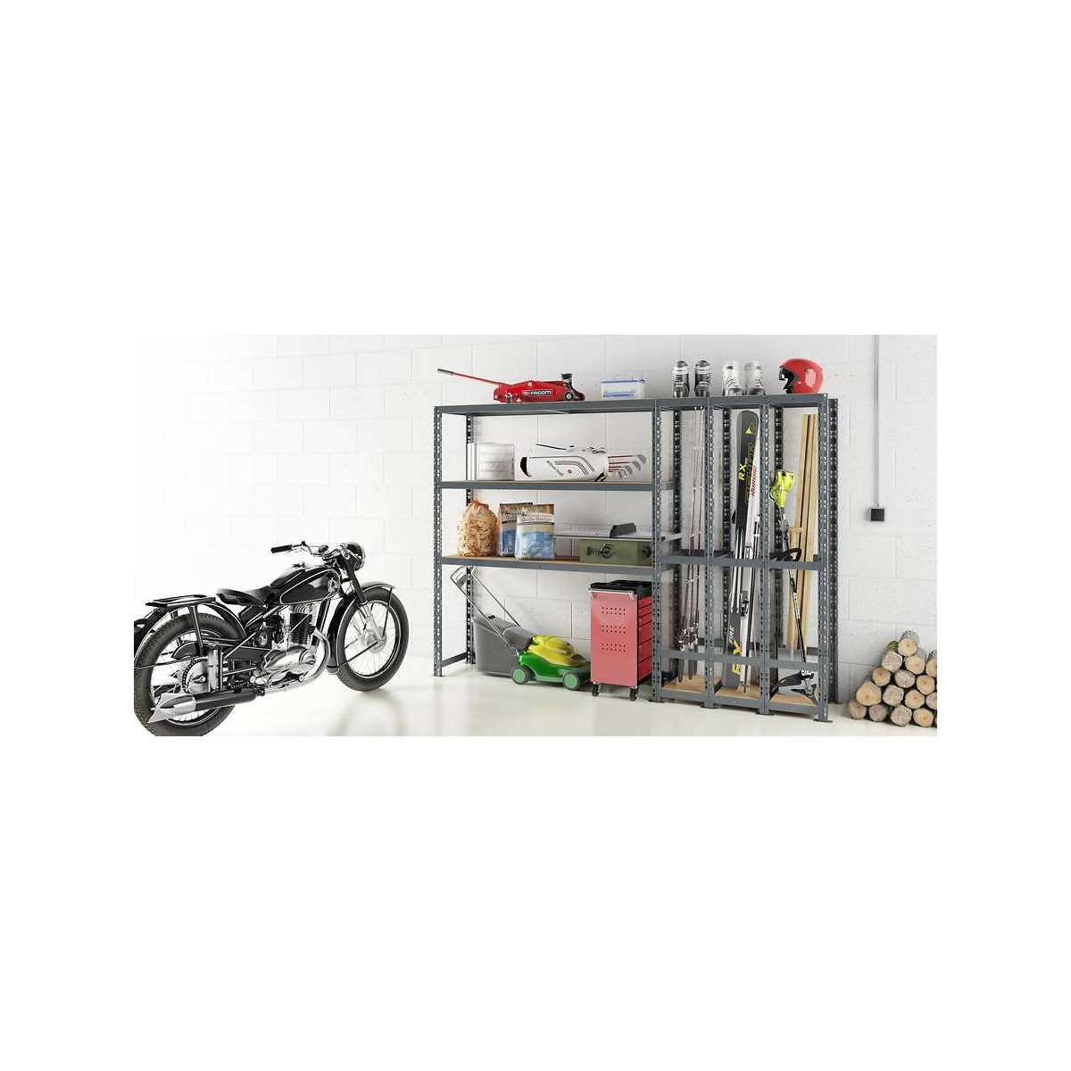 Etagère double verticale et horizontale charge lourde de 255 cm de long. Elle comprend une étagère rack de 3 plateaux 150 cm, une étagère de rangement verticale 3 box 105cm et des montants de renfort au sol anti-écartement. Utilisation double en rangement horizontal pour gros rangement volumineux sur les 3 plateaux et au sol pour matériel de jardinage : tondeuse, aspirateur, produits lourds type bouteilles de gaz ou barbecue et en rangement vertical pour skis, clubs de golf, cannes à pêche, outils de jardin emmanchés. Possibilité d'extension permanente avec toutes les extensions MODULÖ STORAGE Les + du produit Idéal pour utiliser l'espace au mur, Très fonctionnel, il permet d'optimiser en rangement horizontal pour gros rangement volumineux sur les 3 plateaux et au sol pour matériel de jardinage et en rangement vertical, Enorme capacité de charge de 1250 kg, répartie jusqu'à 250 kg par plateau, Grande résistance dans les endroits humides, grâce à sa structure en acier protégée par une peinture époxy gris foncé, Montage rapide, sans vis ni boulon grâce à sa conception innovante d'extension des 2 côtés. Caractéristiques techniques Dimensions hors tout : 255 x 40 x H 192 cm Nombre de plateaux : 5, épaisseur 8 mm Matière plateaux : Aggloméré Capacité de charge : 250 kg/plateau Matière structure : acier finition époxy Montage : Clipsage (fixation au mur recommandée) Coloris : Gris foncé/bois Garantie : 10 ans
