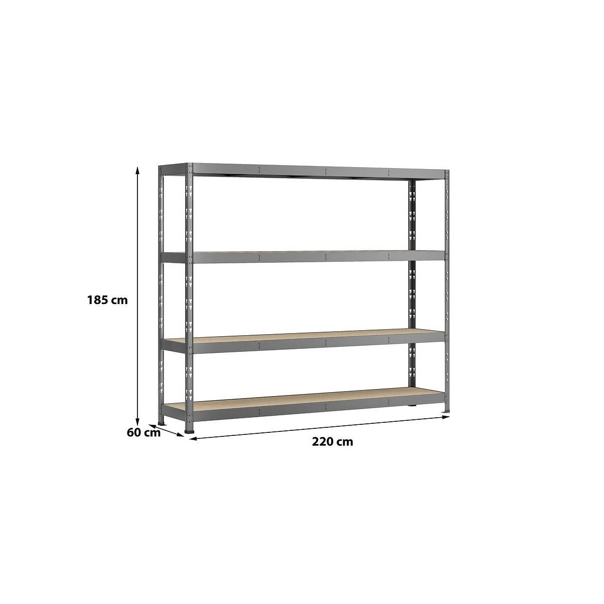 Etagère Rack MODULOSTORAGE de 220 cm de long. Les + du produit Idéal pour optimiser l'espace au mur sur de grandes surfaces, Très fonctionnelle, elle permet d'optimiser le rangement de produits lourds ou encombrants, Modulable en hauteur grâce à ses plateaux amovibles, Enorme capacité de charge de 1200 kg, répartie jusqu'à 300 kg par plateau, Grande résistance dans les endroits humides, grâce à sa structure en acier protégée par une peinture époxy gris foncé. Montage rapide, sans vis ni boulon grâce à sa conception innovante. Caractéristiques techniques Dimensions : 220 x 60 x H 185 cm Nombre de plateaux : 4, épaisseur 8mm Matière plateaux : Aggloméré Capacité de charge : 300 kg/plateau Matière structure : Acier, finition époxy Montage : clipsage (fixation au mur recommandée) Coloris : gris foncé/bois Garantie 5 ans