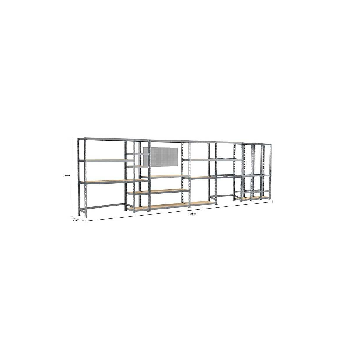Etagère sextuple charge lourde de 605 cm de long. Elle comprenant une étagère rack de 3 plateaux 150 cm, une étagère charge lourde de 6 plateaux 50 cm, une étagère établie de 4 plateaux 100 cm (avec panneau porte outils), une étagère de 4 plateaux 100 cm, une étagère de 3 niveaux dimensions 100 cm, une étagère de rangement verticale 3 box dimensions 105 cm et des montants de renfort au sol anti-écartement. Utilisation concept rangement complet pour le garage permettant sur une longueur de 6 mètres de ranger des petits produits comme les produits alimentaires, chaussures, livres, des gros produits volumineux, des produits lourds, des produits encombrants, des pneumatiques et des produits longs difficiles à ranger. Possibilité d'extension permanente avec toutes les extensions MODULÖ STORAGE Les + du produit Idéal pour utiliser l'espace au mur, Très fonctionnel, il permet d'optimiser le rangement des produits petits, moyens, gros et volumineux et de ranger au sol des produits encombrants en hauteur, Modulable en hauteur grâce à ses plateaux amovibles, Enorme capacité de charge de 6000 kg, répartie jusqu'à 250 kg par plateau, Grande résistance dans les endroits humides, grâce à sa structure en acier protégée par une peinture époxy gris foncé, Montage rapide, sans vis ni boulon grâce à sa conception innovante d'extension des 2 côtés. Caractéristiques techniques Dimensions hors tout : 605 x 40 x H 192 cm Nombre de plateaux : 24, épaisseur 8 mm Matière plateaux : Aggloméré Capacité de charge : 250 kg/plateau Matière structure : acier finition époxy Montage : Clipsage (fixation au mur recommandée) Coloris : Gris foncé/bois Garantie : 10 ans