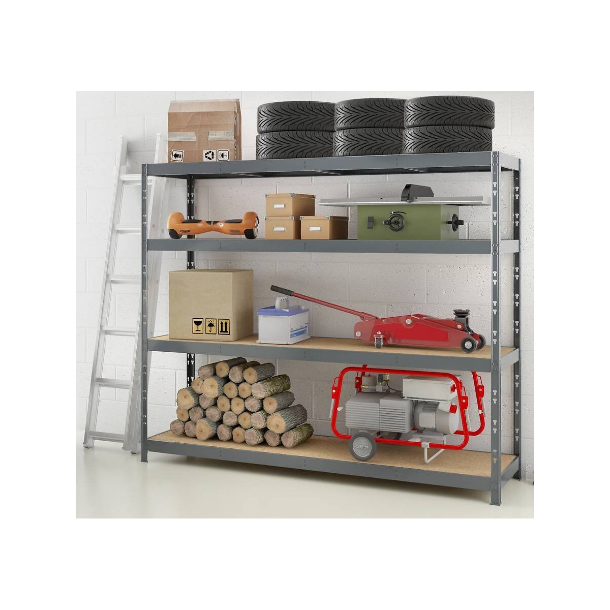 Etagère Rack MODULOSTORAGE charge lourde 220 cm de long. Les + du produit Idéal pour optimiser l'espace au mur sur de grandes surfaces, Très fonctionnelle, elle permet d'optimiser le rangement de produits lourds ou encombrants, Modulable en hauteur grâce à ses plateaux amovibles, Enorme capacité de charge de 1200 kg, répartie jusqu'à 300 kg par plateau, Grande résistance dans les endroits humides, grâce à sa structure en acier protégée par une peinture époxy gris foncé. Montage rapide, sans vis ni boulon grâce à sa conception innovante. Caractéristiques techniques Dimensions : 220 x 50 x H 185 cm Nombre de plateaux : 4, épaisseur 8mm Matière plateaux : Aggloméré Capacité de charge : 300 kg/plateau Matière structure : Acier, finition époxy Montage : clipsage (fixation au mur recommandée) Coloris : gris foncé/bois Garantie 5 ans