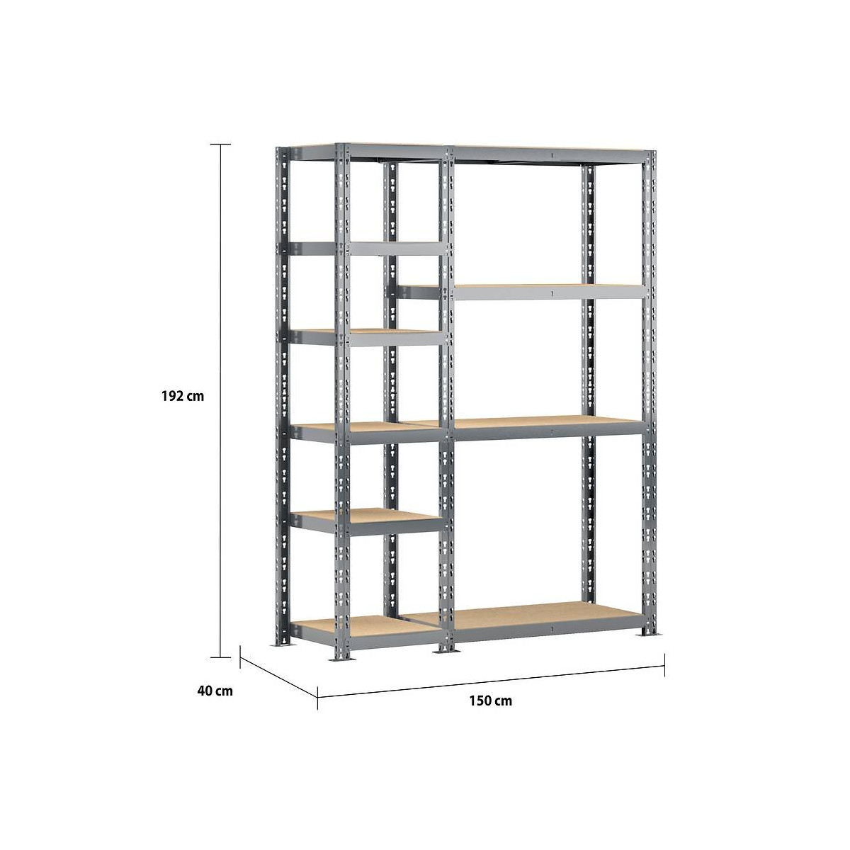 Etagère double charge lourde de 150 cm de long. Elle comprend une étagère de 6 plateaux 50 cm, une étagère établie de 4 plateaux 100 cm et un panneau porte outils. Utilisation double en rangement boites de conserves, bouteilles, chaussures, livres et petits produits et rangement petits et moyens cartons, papier essuie-mains, papier WC. Possibilité d'extension permanente avec toutes les extensions MODULÖ STORAGE Les + du produit Idéal pour utiliser l'espace au mur, même sur de petites surfaces, Très fonctionnel, il permet d'optimiser le rangement des petits et moyens produits et réaliser des travaux de bricolage, Modulable en hauteur grâce à ses plateaux amovibles, Enorme capacité de charge de 2500 kg, répartie jusqu'à 250 kg par plateau, Grande résistance dans les endroits humides, grâce à sa structure en acier protégée par une peinture époxy gris foncé, Montage rapide, sans vis ni boulon grâce à sa conception innovante d'extension des 2 côtés. Caractéristiques techniques Dimensions hors tout : 150 x 40 x H 192 cm Nombre de plateaux : 10, épaisseur 8 mm Matière plateaux : Aggloméré Capacité de charge : 250 kg/plateau Matière structure : acier finition époxy Montage : Clipsage (fixation au mur recommandée) Coloris : Gris foncé/bois Garantie : 10 ans