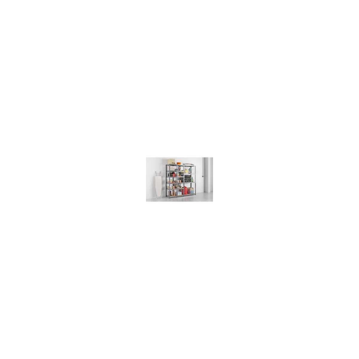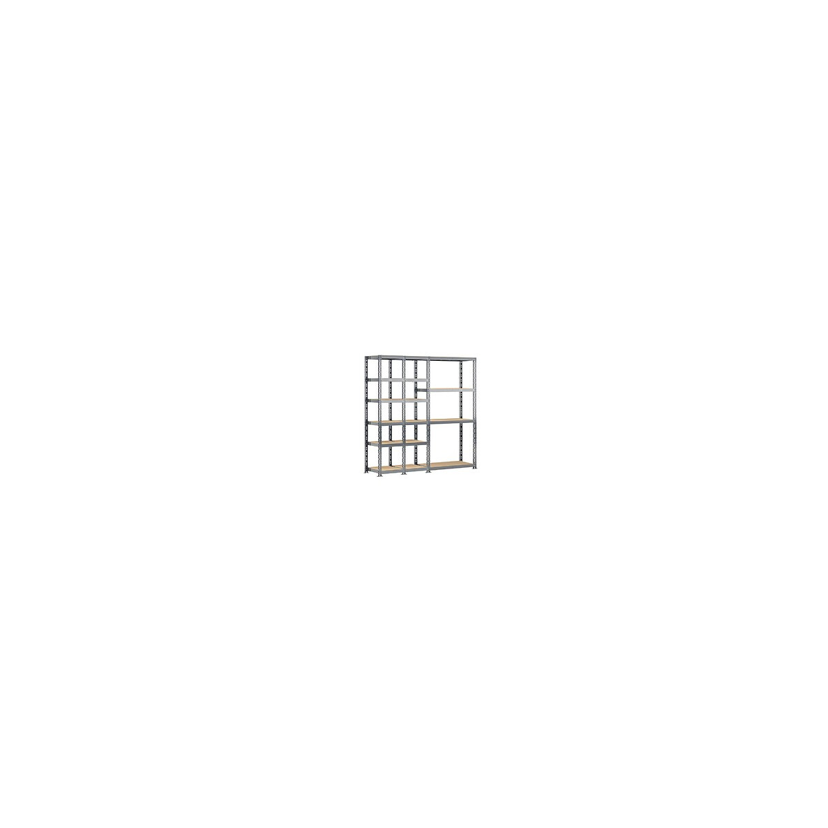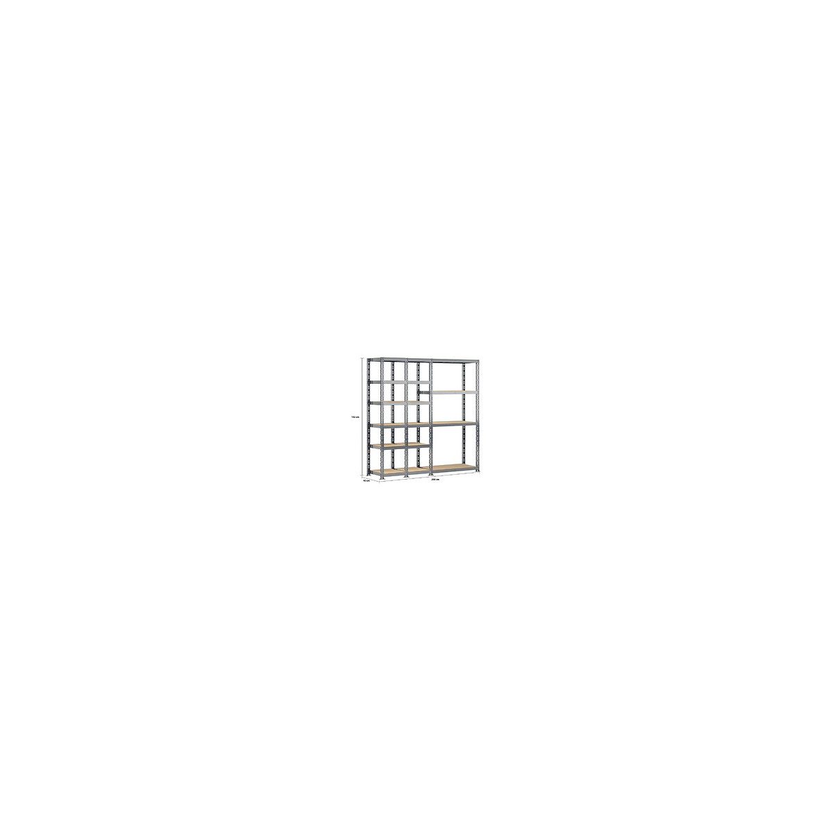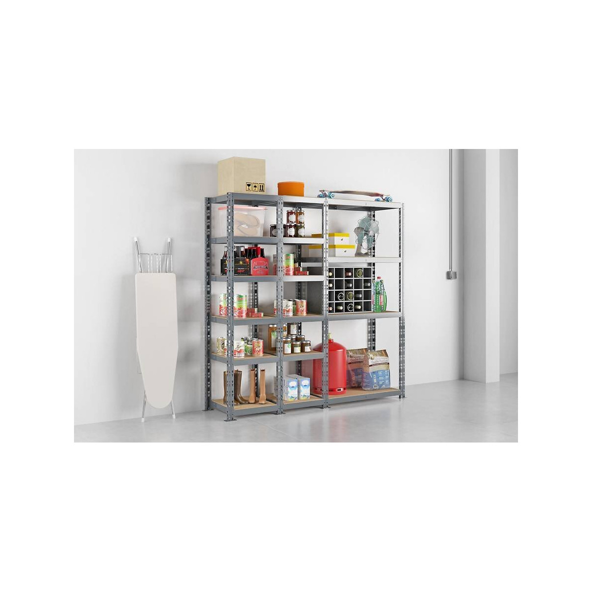 Etagère triple charge lourde de 200 cm de long. Elle comprend 2 étagères de 6 plateaux 50 cm et une étagère charge lourde de 4 plateaux 100 cm. Utilisation double en rangement boites de conserves, bouteilles, chaussures, livres, petits produits et rangement petits et moyens cartons, papier essuie-mains, papier WC. Possibilité d'extension permanente avec toutes les extensions MODULÖ STORAGE Les + du produit Idéal pour utiliser l'espace au mur, Très fonctionnel, il permet d'optimiser le rangement des petits, des moyens produits et ranger des gros cartons, du gros matériel de bricolage, de lavage et de jardinage, Modulable en hauteur grâce à ses plateaux amovibles, Enorme capacité de charge de 4000 kg, répartie jusqu'à 250 kg par plateau, Grande résistance dans les endroits humides, grâce à sa structure en acier protégée par une peinture époxy gris foncé, Montage rapide, sans vis ni boulon grâce à sa conception innovante d'extension des 2 côtés. Caractéristiques techniques Dimensions hors tout : 200 x 40 x H 192 cm Nombre de plateaux : 16, épaisseur 8 mm Matière plateaux : Aggloméré Capacité de charge : 250 kg/plateau Matière structure : acier finition époxy Montage : Clipsage (fixation au mur recommandée) Coloris : Gris foncé/bois Garantie : 10 ans
