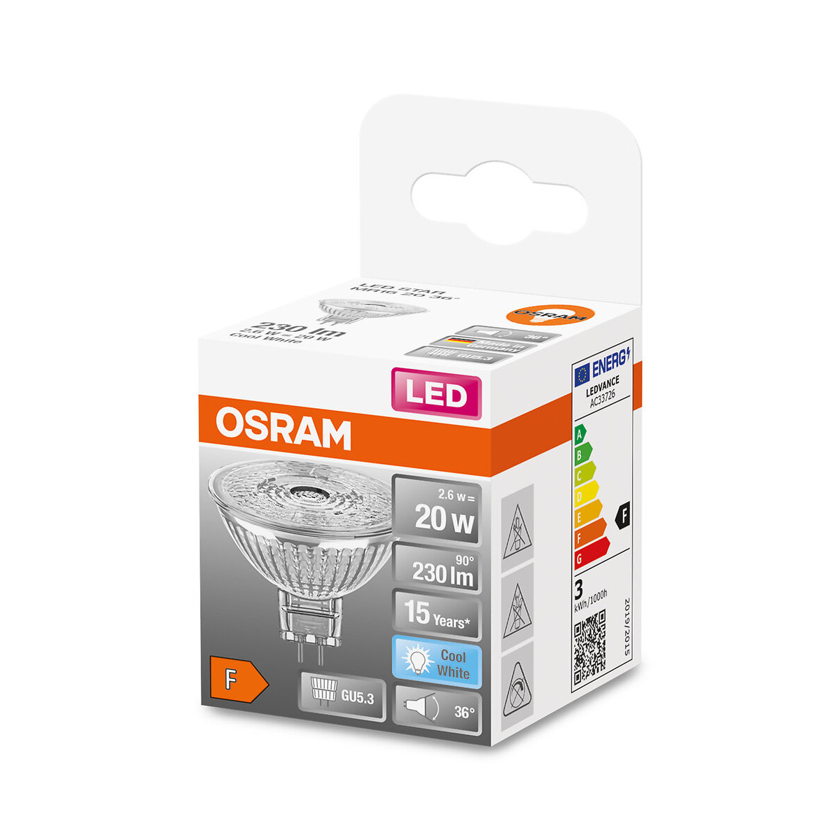 Réflecteur LED GU5.3, 2.60 W, 12 V, Blanc froid, 4000 K, 100% Sans mercure - Le meilleur de la qualité OSRAM • Consommation d'énergie 3 kWh/1000h à 230 lm • Longue durée de vie – jusquà 15000 heures et 100000 cycles de commutation • Lumière blanc froid idéale pour améliorer la concentration et optimiser les performances visuelles dans la cuisine, la salle de bain et le bureau • Allumage instantané, pas de temps de préchauffage • Succède aux ampoules classiques, se substitue à un spot halogène de 20 W (utilisation en extérieur uniquement avec des luminaires appropriés) • Faible émission de chaleur (comparé aux produits standards de référence)Spécifications techniques