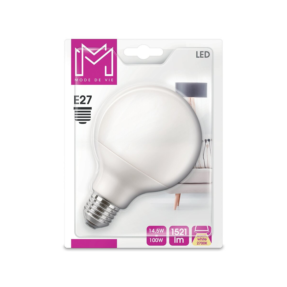 Ampoule LED Globe équivalente à une lampe à incandescence 100W, culot E27, lumière chaude de 2700K. Non compatible avec un variateur de lumière.Spécifications techniques