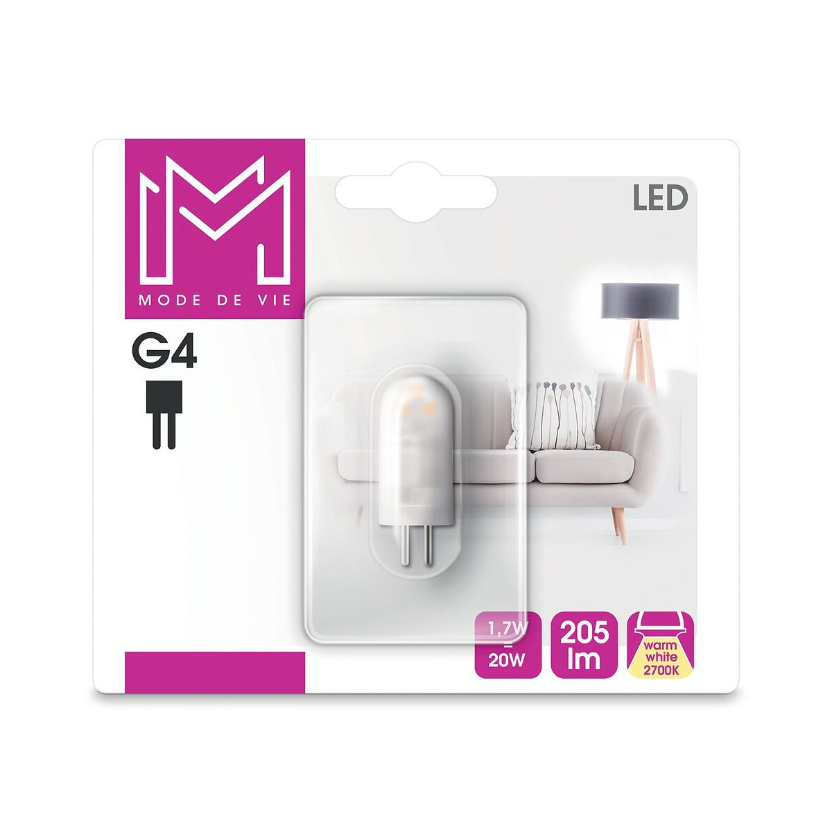 Ampoule LED G4 équivalente à une lampe à incandescence 20W, culot G4, lumière chaude de 2700K. Non compatible avec un variateur de lumière.Spécifications techniques