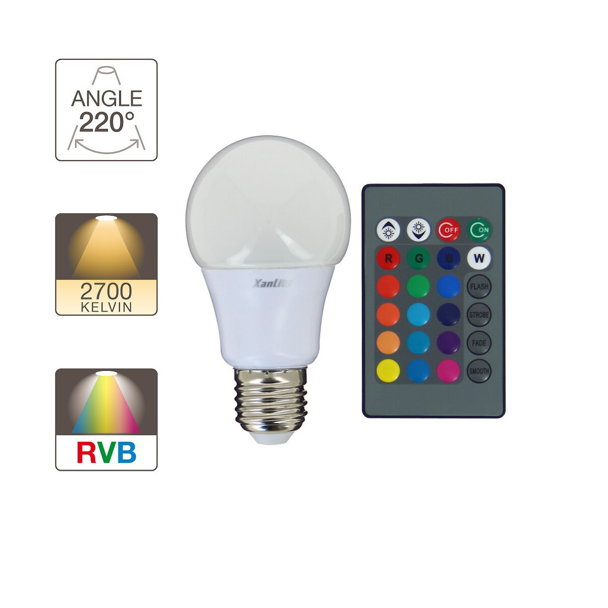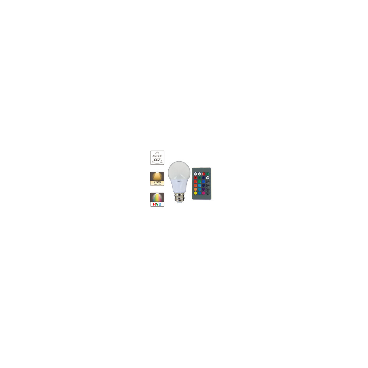 Ampoule led standard A60. Blanc + couleurs changeantes (RVB) par télécommande. Culot E27. Consommation 8W équivalent 60W, 806 lumens. Température de couleur : Blanc chaud, 2700 kelvin. Angle 180°. Classe énergétique : A+.<\BR>Couleurs changeantes par télécommande.