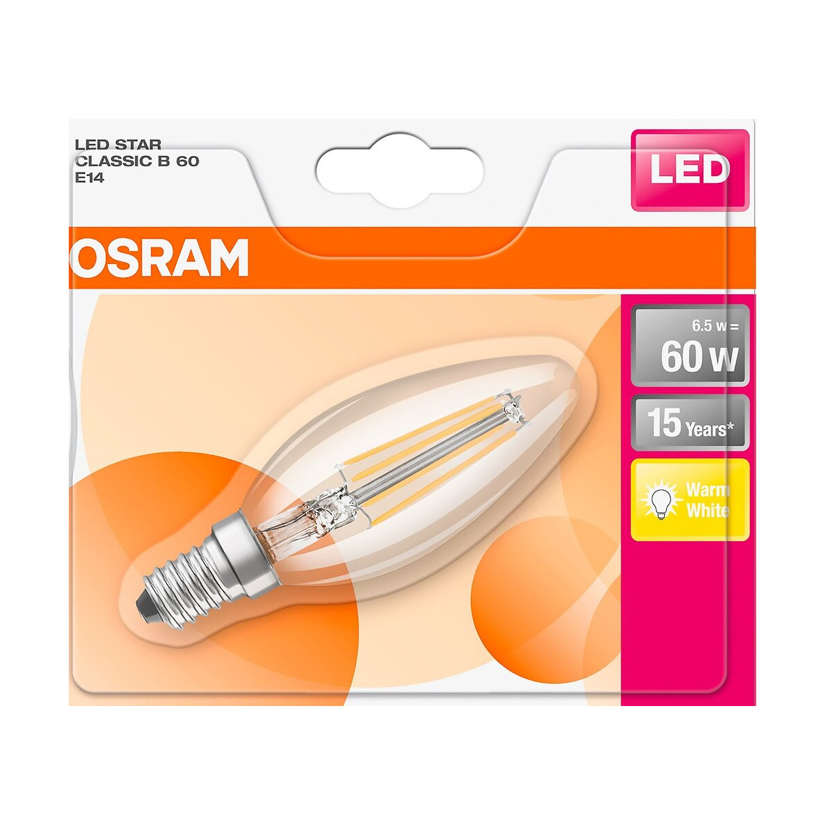 Ampoule LED filament OSRAM de forme flamme, culot E14, consomme 6,5W équivalent 40W, 470 lumens, lumière blanc chaud 2700K, finition verre clair, éclairage instantané, durée de vie 15000h, garantie 3 ans, classe énergétique A++Spécifications techniques