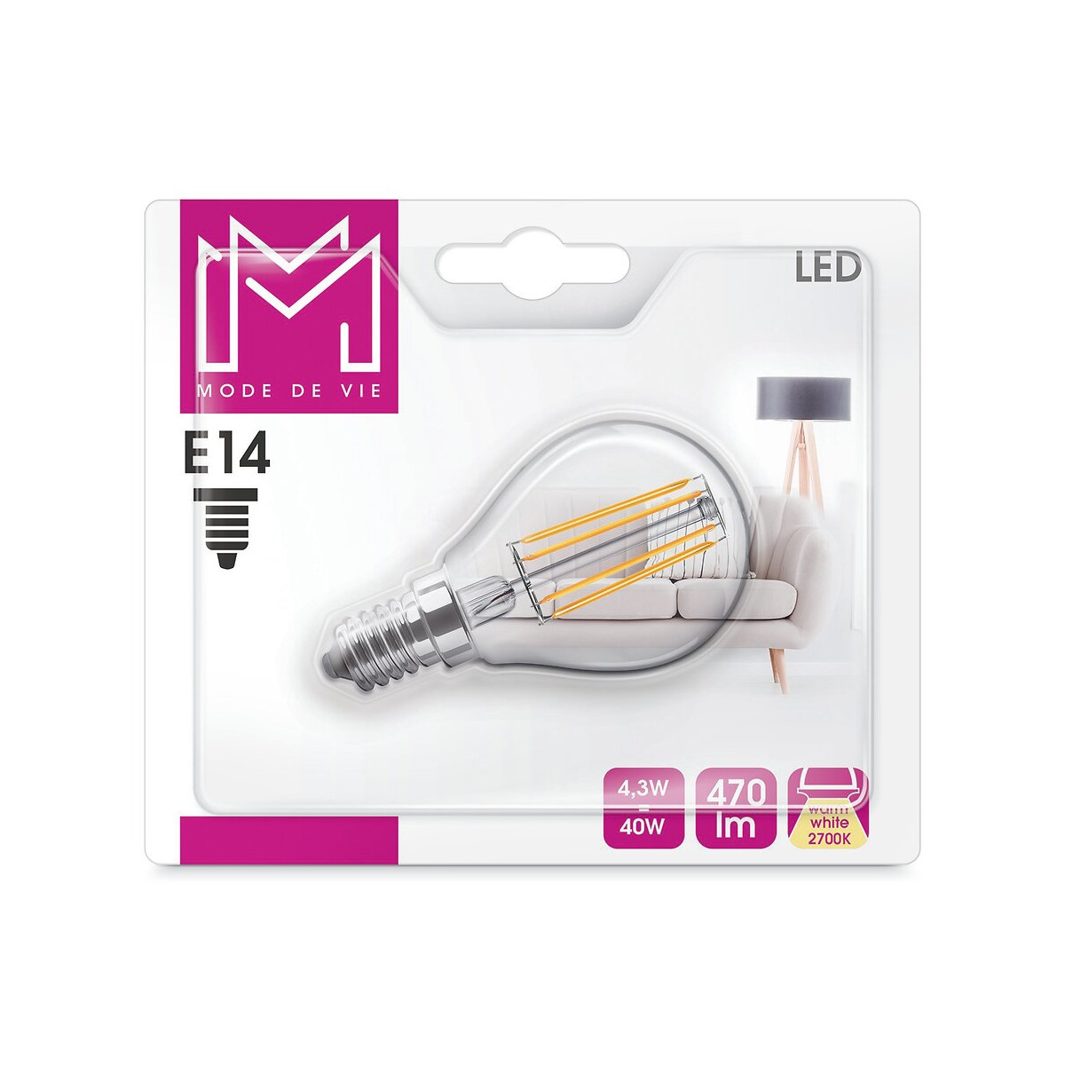 Ampoule LED Sphérique équivalente à une lampe à incandescence 40W, culot E14, lumière chaude de 2700K Filament. Non compatible avec un variateur de lumière.Spécifications techniques