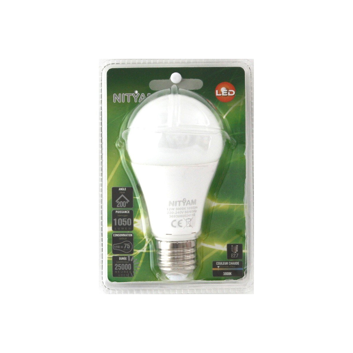 Ampoule LED E27 standard globe 12 W blanc chaud Nityam. 12 Watts pour une équivalence de 75 Watts - 1050 lumens. Economise jusqu'à 80% d'énergie. Durée de vie de 25 000 heures.