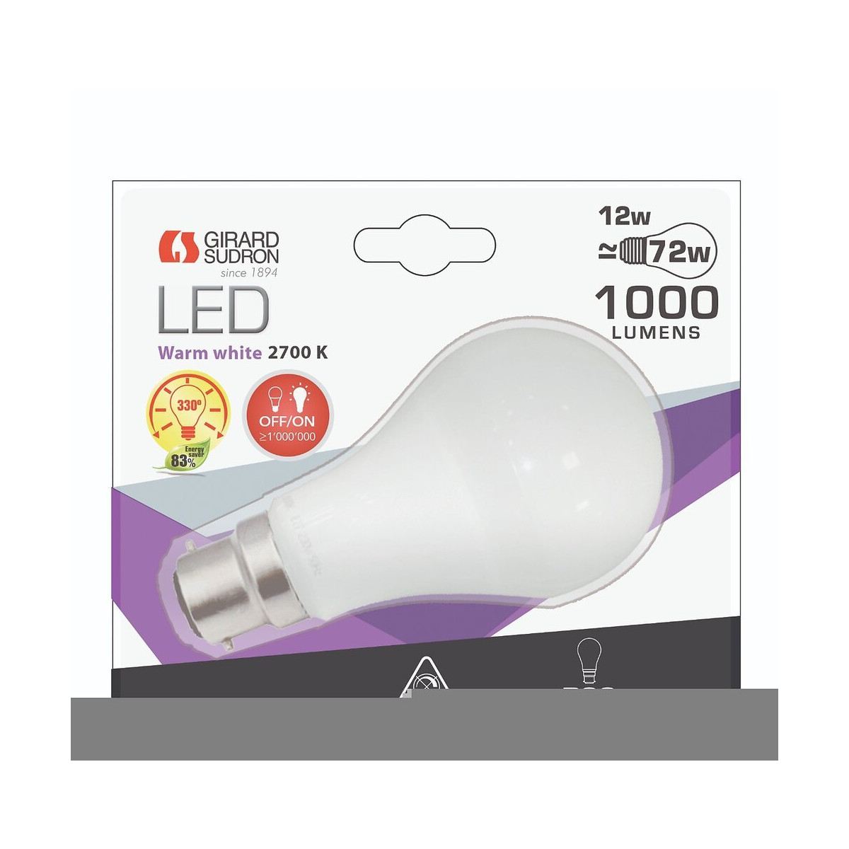 Ampoule standard LED de la marque Girard Sudron, d'une puissance de 12W et 1000lumens. L'ampoule a un culot de taille B22 (baïonnette). Sa couleur d'éclairage est de 2700K soit une couleur chaude.