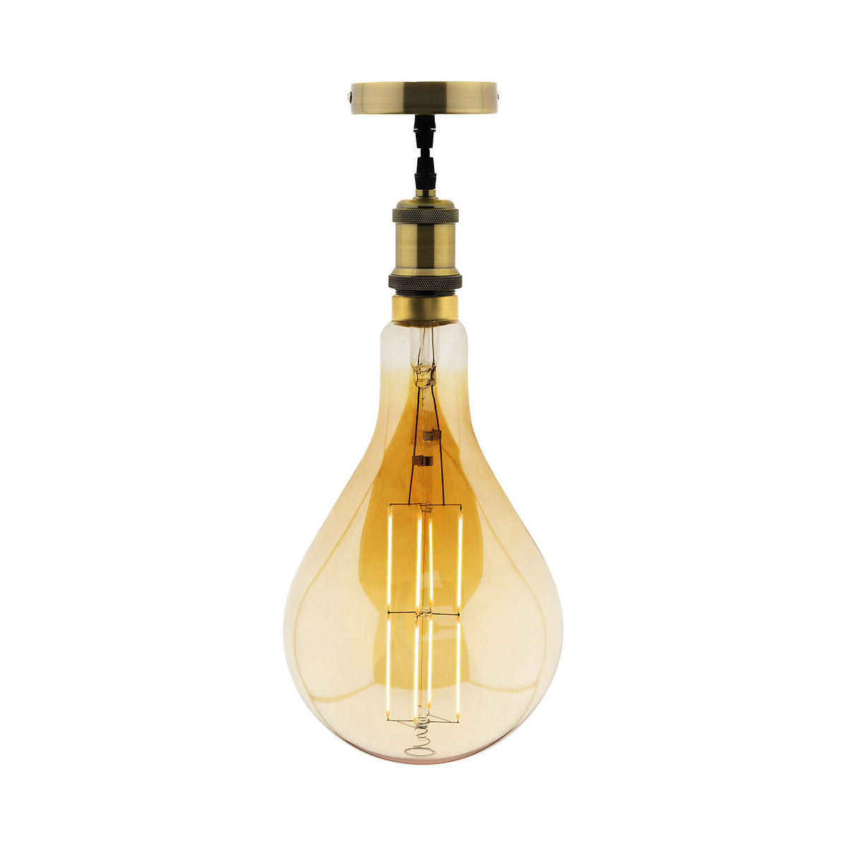 Cette ampoule filament LED géante ambrée livrée avec sa suspension en métal cuivré vous permet de créer une ambiance personnalisable et vintage tout en bénéficiant de la technologie LED. Economique et écologique, elle consomme 80% d'énergie en moins qu'une ampoule traditionnelle et vous assure une durée de vie de 15 000 heures. Caractéristiques: Câble env. 85 cm H03VV-F, 2x0,75mm², 5W, 350Lm, 2500K (blanc chaud), culot E27.