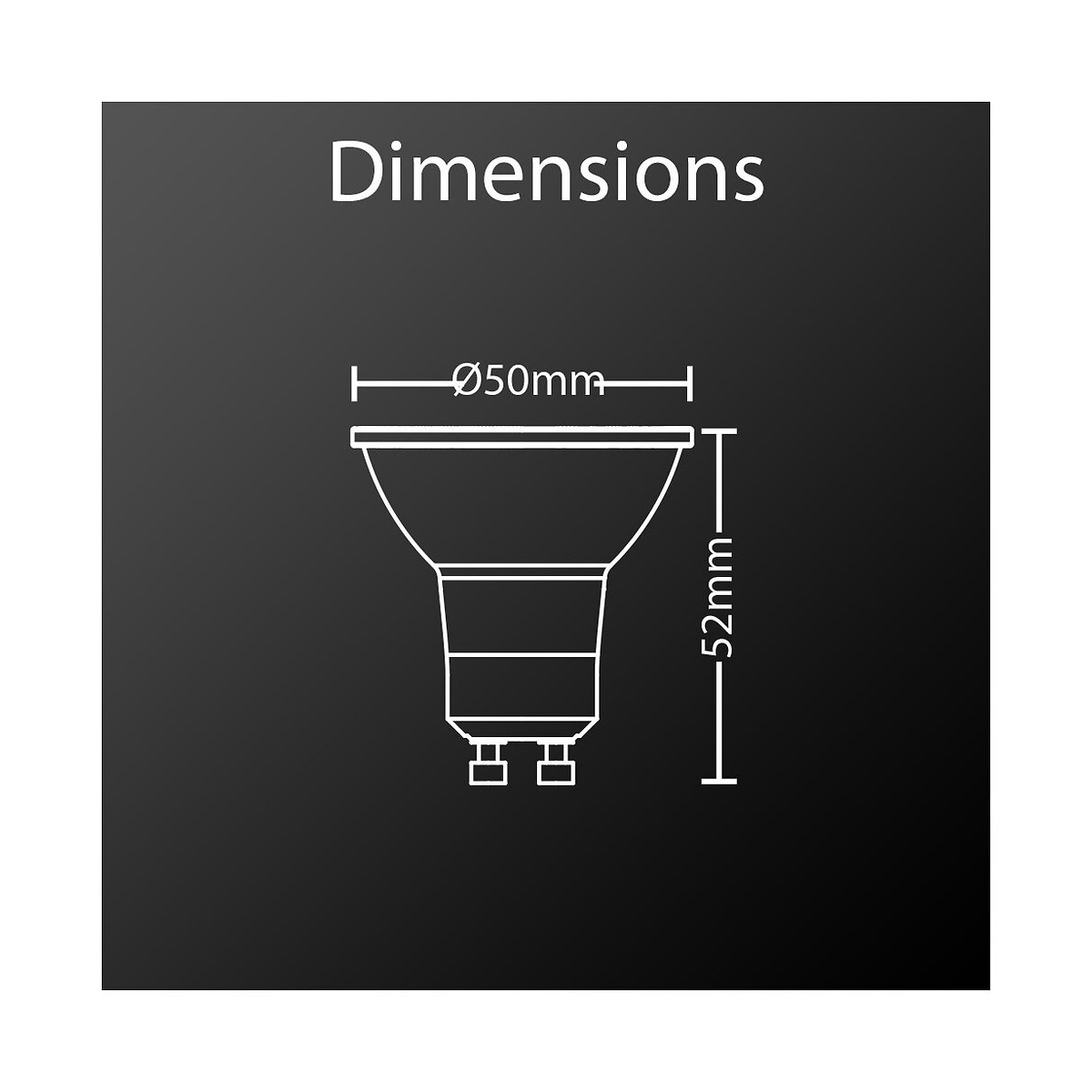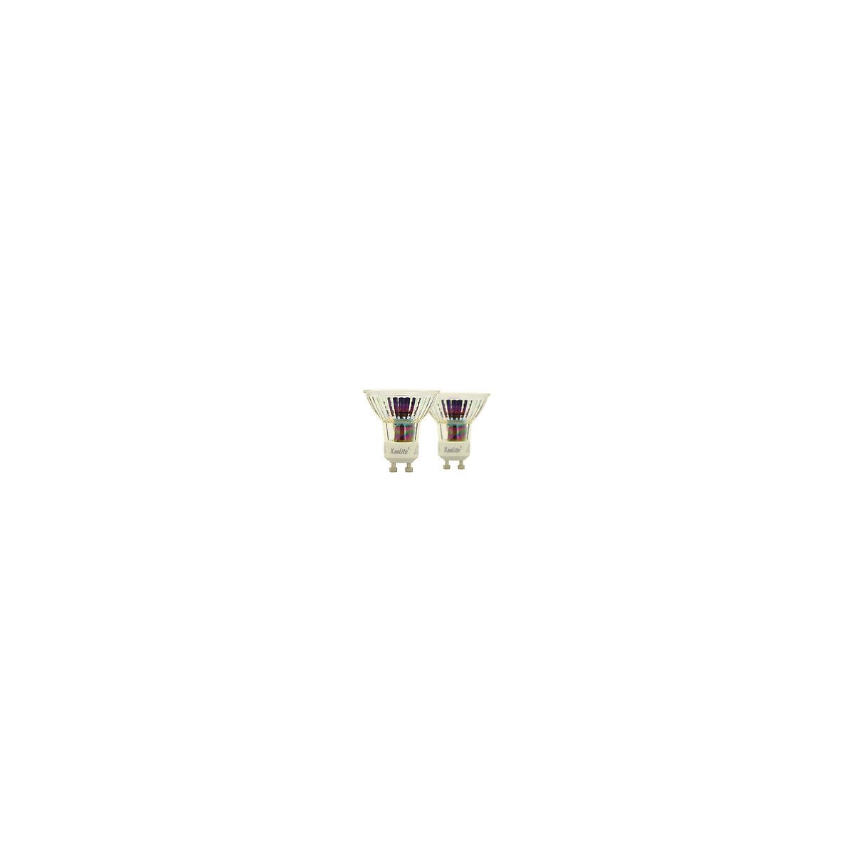 Lot de 2 ampoules spot Consommation : 5W Équivalent à une puissance d’éclairage de 50W chez une ampoule incandescente. Forme de l’ampoule : spot Culot : GU10 Dimensions : 5,2 cm x 5 cm Durée de vie : 15 000 heures / ON/OFF : x30 000 Angle d’éclairage : 36 ° (éclairage focalisé) Intensité lumineuse : 345 lumens Votre ampoule sera idéale pour un éclairage de vos pièces à vivre. Attention, votre ampoule n'est pas compatible avec un variateur d'intensité. 230V / 50Hz Couleur d’éclairage : blanc chaud (2700 K) IRC>80 : pour un rendu des couleurs au plus proche de leur couleur naturelle. Groupe 0 : pas de risque pour la vue quel que soit le temps d’observation de la source lumineuse. Performance énergétique : A+ Votre produit est recyclable (pensez à rapporter vos ampoules en magasin pour qu'il soit pris en charge par les centres de tri) Garantie 5 ans