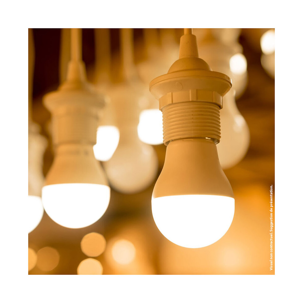 Consommation : 9,4W Équivalent à une puissance d’éclairage de 60W chez une ampoule incandescente. Forme de l’ampoule : standard (A60) Culot : E27 (culot à vis) Dimensions : 11 cm x 6 cm Durée de vie : 15 000 heures / ON/OFF : x50 000 Angle d’éclairage : 180 ° (éclairage focalisé) Intensité lumineuse : 806 lumens Votre ampoule sera idéale pour un éclairage de vos pièces à vivre. Votre ampoule est dite dimmable, c’est-à-dire compatible avec un variateur d'intensité. Réglez ainsi la luminosité de vos pièces selon vos besoins. 230V / 50Hz Couleur d’éclairage : blanc naturel/neutre (4000 K) IRC>80 : pour un rendu des couleurs au plus proche de leur couleur naturelle. Groupe 0 : pas de risque pour la vue quel que soit le temps d’observation de la source lumineuse. Performance énergétique : A+ Votre produit est recyclable (pensez à rapporter vos ampoules en magasin pour qu'il soit pris en charge par les centres de tri) Garantie 5 ans