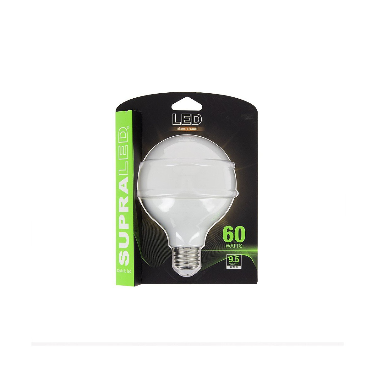 Ampoule LED standard (G95), au culot à vis E27 permettant une installation simple et rapide. Avec sa température de couleur de 2700K d’aspect blanc chaud, cette ampoule SupraLED offrira un éclairage chaleureux à votre intérieur. Elle sera idéale pour vos moments de détentes dans les pièces à vivre et les chambres. Nous recommandons également ce produit pour les restaurants, les hôtels, les bars ou tout autre établissement voulant amener une ambiance relaxante et cocooning dans ses espaces. Équipée de la technologie LED, elle dispose d’une faible consommation d’énergie de 9,5W, équivalant à l’éclairage d’une ampoule incandescente de 60W. Cela vous permettra de faire des économies d’énergie (jusqu’à 90%) pour réduire vos factures d’électricité. De plus, cette ampoule s’allume instantanément sans chauffer, ce qui lui permet de bénéficier d’une durée de vie prolongée : jusqu’à 25 000 heures. Cela vous évitera notamment de remplacer vos ampoules tous les ans. Par ailleurs, au-delà de tous les avantages de cette ampoule LED, il est important de savoir qu’elle est également recyclable dans tous les points de collecte Recyclum.