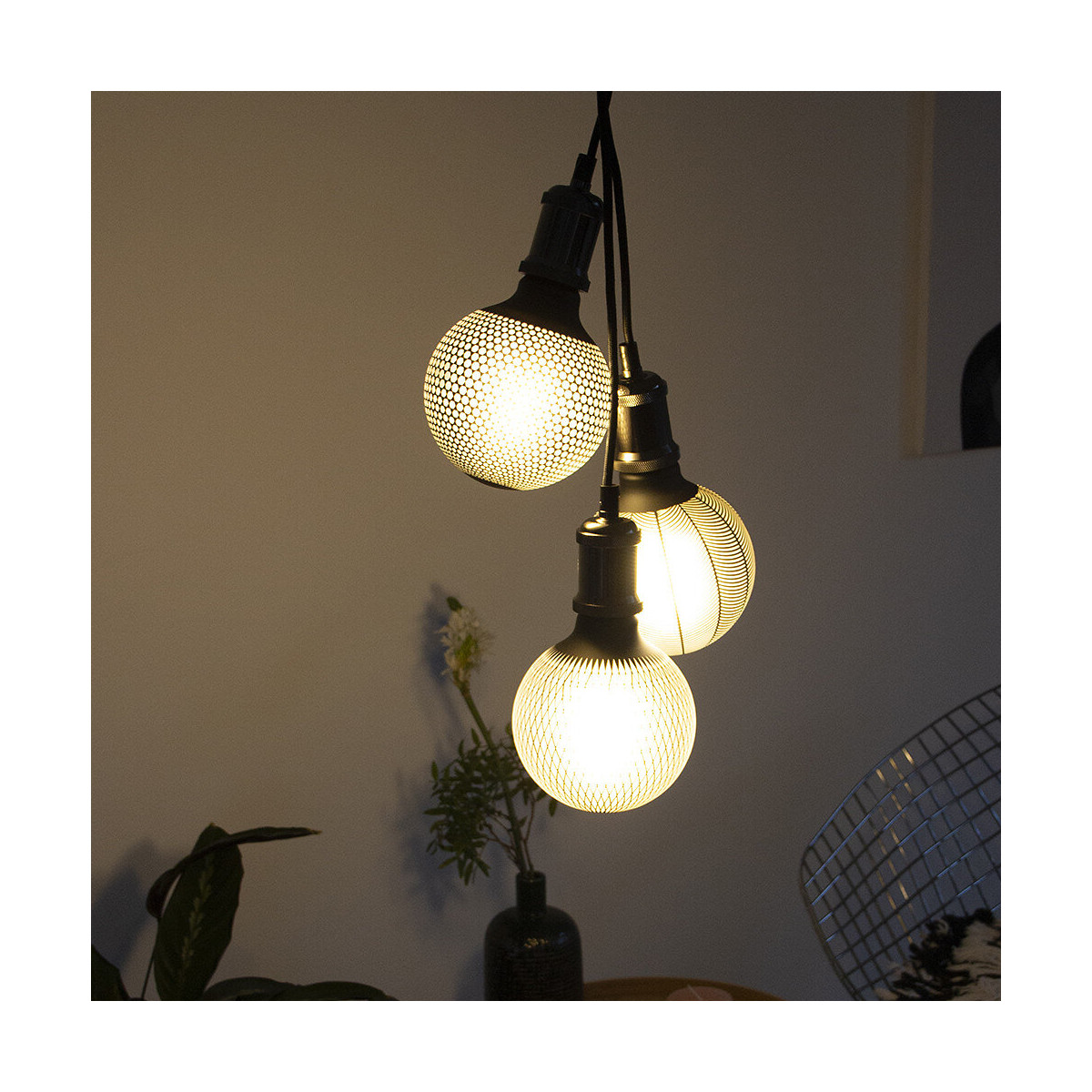 Ampoule Déco LED Filament, Aspect Filet Noir, G125, culot E27, 4W cons. 2700K Blanc Chaud Ampoule LED G125 au gros culot à vis E27 permettant une installation simple et rapide. Opter pour un culot E27 c’est choisir une ampoule qui s’adaptera à la majorité des luminaires ( lampes à poser , des suspensions ) afin de sublimer votre pièce. Avec sa température de couleur d’aspect blanc chaud, de 2700 kelvins idéale pour créer des ambiances chaleureuses et accueillantes. Avec ses lumens de 180 lumens, cette ampoule offrira un parfait éclairage d’appoint pour vos chambres ou salon. Avec son angle large elle sera idéale pour vos moments de détente dans vos pièces préférées : salon, salle à manger ou chambre afin de passer du bon temps en famille ou bien faire les devoirs avec vos enfants. Équipée de la technologie LED, elle dispose d’une faible consommation d’énergie de 4W, équivalant à la puissance d’éclairage d’une ampoule incandescente de 24W. Ainsi faites des économies d’énergie (jusqu’à 90%) pour réduire vos factures d’électricité. À savoir : comme avec toutes nos ampoules XanLite , optez pour la technologie LED, c’est faire le choix d’ampoules : Moins gourmandes en énergie : jusqu’à 90% d’économies d’énergie réalisées et certifié d’une consommation A pour un impact environnemental responsable Plus sûres : grâce à sa technologie, le verre d’une ampoule LED ne chauffe que très faiblement. Ainsi, les risques de brûlure et d’incendie sont largement diminués, permettant une utilisation plus diversifiée de l’ampoule (suspension basse, ampoule sur lampe à poser sans abat-jour, spot bas etc.). De plus, la LED ne produit ni rayonnement UV, ni rayonnement infrarouge, et n’est composée d’aucuns produit dangereux (comme le mercure par exemple). Attention cependant, votre produit comme tout produit électrique produit électrique produit de la chaleur. Aussi, après une utilisation prolongée, le culot de votre ampoule ou bien son dissipateur peuvent être chaud. Qui durent : les ampoules LED ont une longévité plus longue que les autres technologies et ont une durée de vie de 15000 heures (soit environ 7x plus longtemps qu’une ampoule classique). Avec un meilleur rendu des couleurs : la technologie LED permet d’atteindre un IRC >80*. Ainsi, vos ampoules vous apporteront une lumière de qualité. Dont l’allumage est instantané : une ampoule LED met moins d’une seconde pour s’allumer. Par ailleurs, au-delà de tous les avantages de cette ampoule LED, il est important de savoir qu’elle est également recyclable dans tous les points de collecte Recyclum ou autre organisme équivalent (à retrouver dans vos magasins de bricolage ou magasins spécialisés types Boulanger). Pour mettre en valeur votre ampoule n’hésitez pas à l’agrémenter par nos différents luminaires . Votre ampoule est garantie 5 ans. Attention : cette ampoule est un produit de catégorie électrique, veiller à ne pas le laisser à portée des enfants. Les caractéristiques techniques de nos produits sont indicatives, elles peuvent être amenées à évoluer suite aux réglementations européennes, aux améliorations techniques ou évolutions technologiques. *IRC, ou Indice de Rendu de Couleurs, est une valeur comprise entre 1 et 100, qui indique avec quel degré de précision une source lumineuse peut restituer la couleur des objets. Sachant que la lumière du jour est celle qui permet au mieux de restituer les couleurs (IRC=100). Plus l’IRC est élevé, plus les couleurs sont vives et précises.