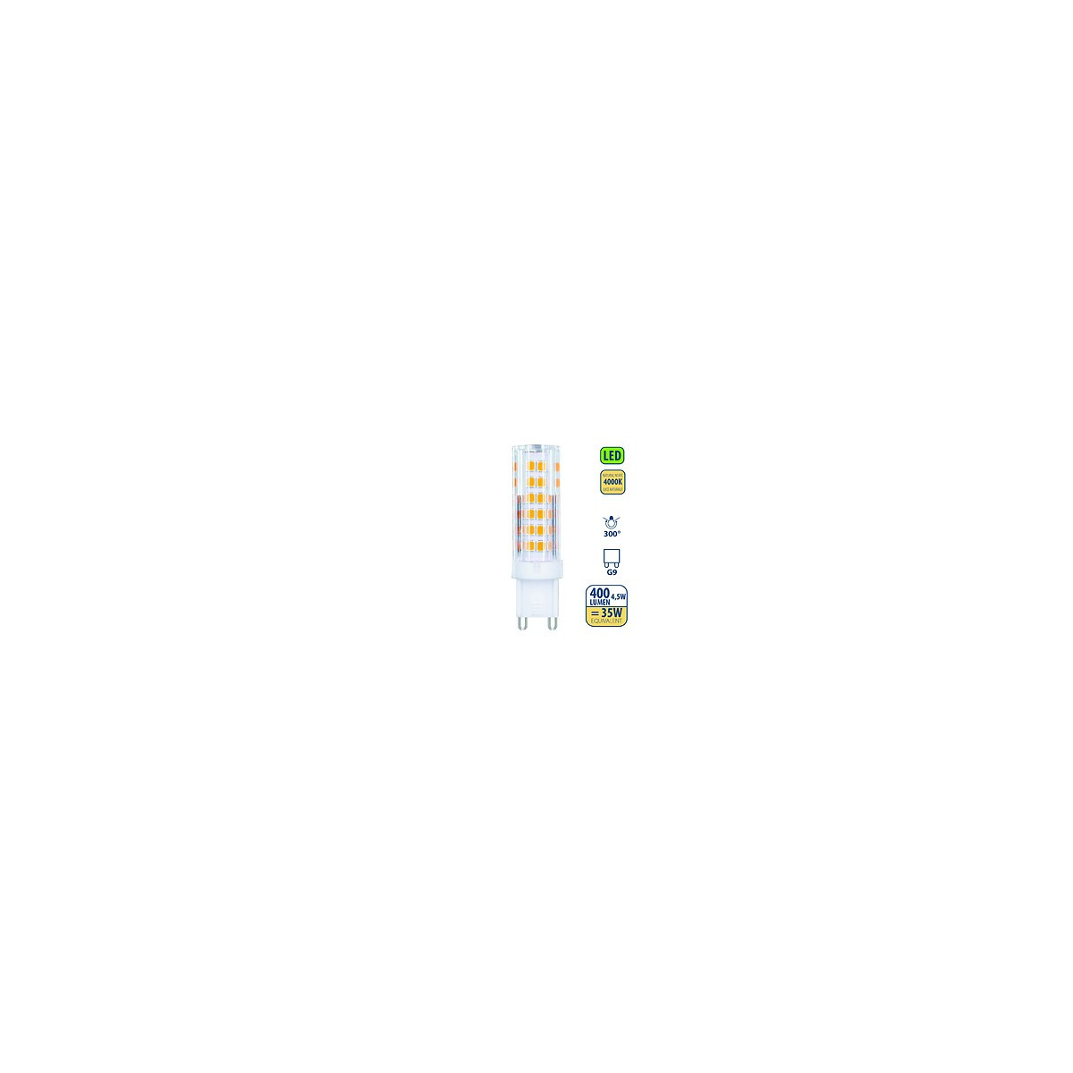 Économies d'énergie - Ampoule G9 LED Velamp 4.5W : parfaite pour le remplacement des ampoules halogènes de 20W à 40W, vous pouvez donc économiser jusqu'à 90% de votre facture d'électricité. Moins de remplacements et une durée de vie plus longue. Qualité supérieure - Ne contient ni filaments ni mercure. L'ampoule LED G9 Blanc Naturel protège vos yeux et crée une atmosphère confortable. Les ampoules LED VELAMP sont certifiées CE, sans danger pour la famille et l'environnement. Larges applications - Cette lampe LED convient à toutes les lampes LED à base standard AC 220-240V, G9. Elle est rapide et facile à installer. Ampoule LED G9 idéale pour cuisines, salon, chambre et couloirs, lustres, spots.... Super Lumineuse - Ampoule LED G9 avec LED SMD2835, angle du faisceau 300°, blanc naturel 4000K, indice de rendu des couleurs > 80 (pour un rendu fidèle des couleurs ), sans scintillement, faible génération de chaleur, faible consommation de courant, longue durée de vie. Attention - Veuillez vérifier soigneusement les dimensions avant d'acheter et vérifier si elle convient à votre luminaire. (Taille : 60 mm x 16,2 mm) ; Ampoule non dimmable, veuillez ne pas l'utiliser avec un gradateur.