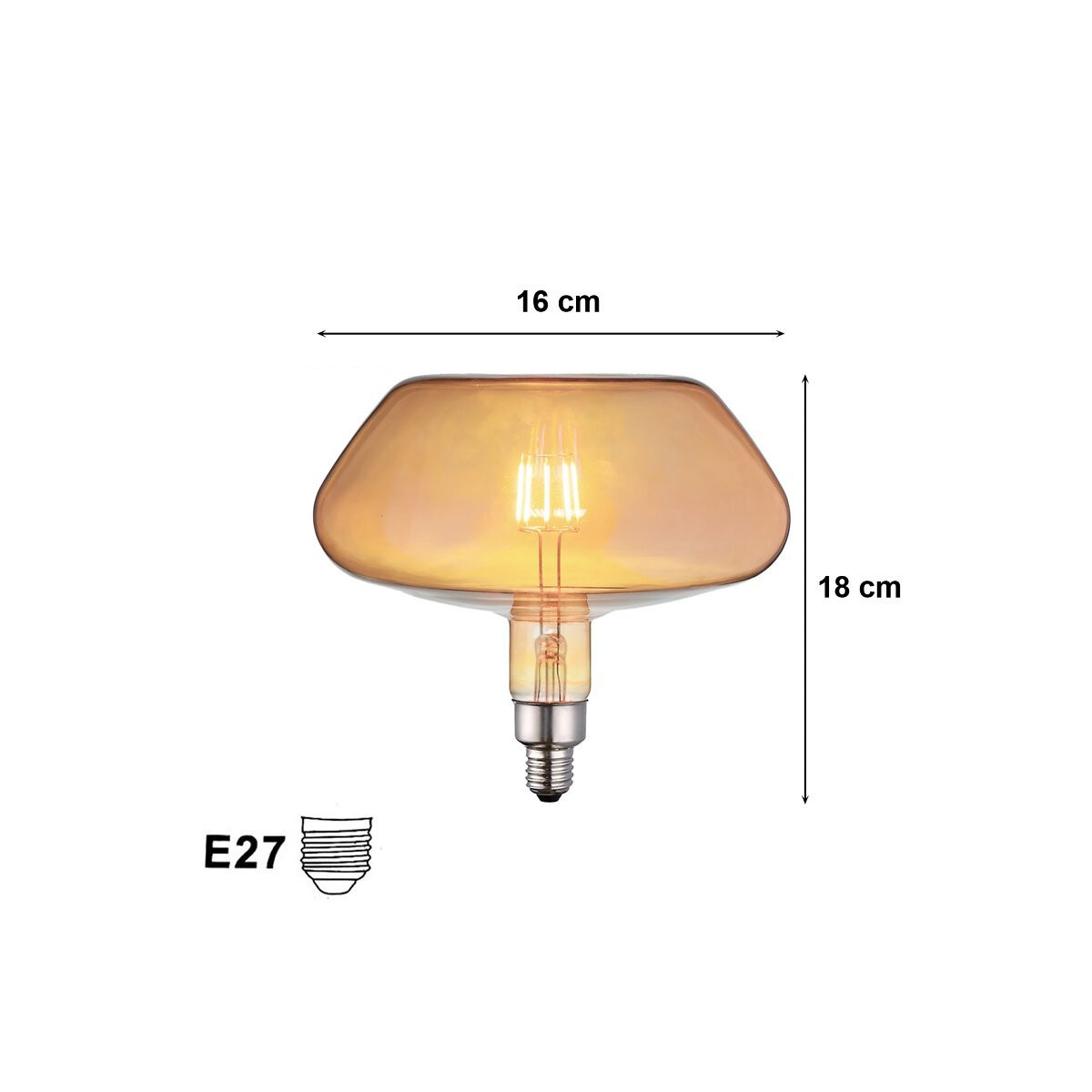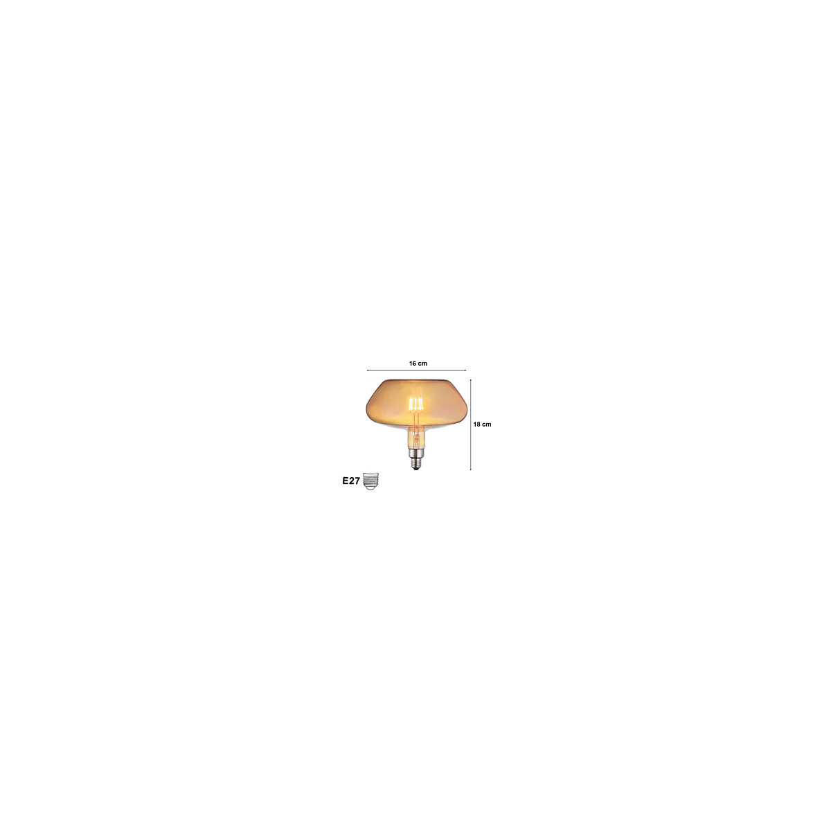 Cette Ampoule décorative avec filament LED a une puissance de 8W. L'intensité lumineuse émise atteint 720 lumens, équivalant à l'éclairage d'une ampoule halogène de 70W. Sa forme très particulière ajoutera une touche sophistiquée à votre environnement et de manière unique. Sa lumière chaude de 2700K et son verre ambré donneront un look charmant à votre pièce à vivre ou un lieu public (restaurant, bar, ...). Design, longue durée de vie et faible consommation d'énergie, en feront l'ampoule LED à filament parfaite. Découvrez toutes notre gamme d'. #Fiche Technique# AMPOULE LED E27 FILAMENT 8W CHAMPIGNON Puissance: (en Watt) 8W Tension: (en Volt) 220-240V Fréquence: (en Hertz) 50-60Hz Luminosité: (en Lumens) 720 lm Dimension du produit: (en mm) Ø160 x 180 mm Indice Rendu de couleur: (en Ra) 80 Indice de protection: IP20 Angle d'éclairage: 360° Fonctionnalités LED Non Dimmable Durée de vie: (en +/- heures) ~ 20 000h Classe énergétique: A+ Garantie: 2 ans Certification: CE #Guides utiles#