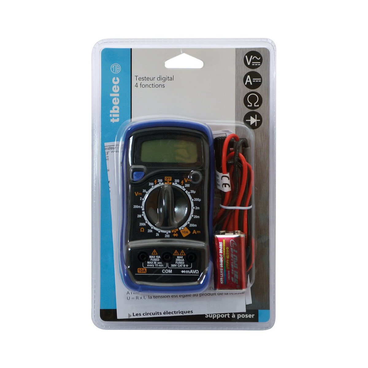 Testeur digital de courant 6 fonctions de Tibelec est destiné à la mesure de la tension alternative et continue, de l'intensité alternative et continue, de la résistance d'un circuit ou d'un composant électrique. Il mesure également la continuité du courant avec buzzer, et fait office de testeur de diode et de transistor. Tension de mesure max : 300V. Intensité de mesure max : 10A. Résistance max : 2 méga Ohms.