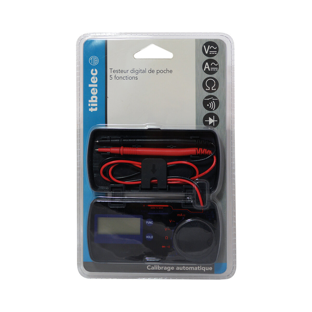 5 fonctions mesure de la tension 250V ac dc l'intensité 200ma ac dc la résistance (ohmmètre) 20m ohms la continuité avec buzzer diode calibrage automatique boîtier anti choc 2 piles lr44 1 5v fournies indicateur d'usure des piles 114 56 23mm.