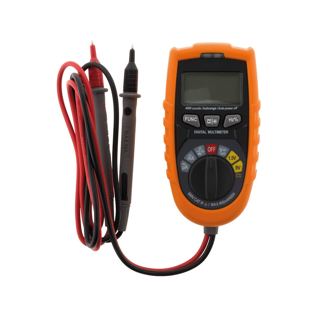 Multimètre digital automatique avec 12 fonctions et d'un mode auto calibrage. Ce multimètre dispose d'un écran LCD, de pointes de touche intégrées , de 2 pilles AAA 1,5V fournies.