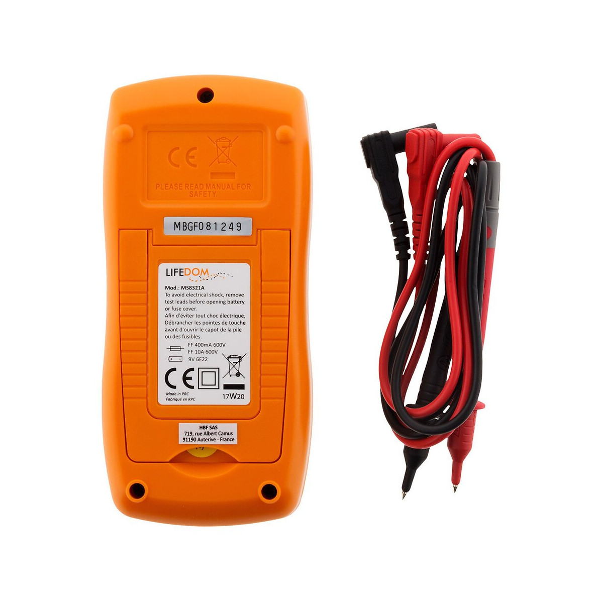 Multimètre antichoc 17 calibres HQ Multimètre digital universel avec 8 fonctions. L'appareil s'éteint automatiquement au bout de 15 minutes d'inactivité. Ce multimètre dispose d'un écran LCD, d'une pile 9V6F22, (fournie), d'un indicateur de batterie faible et d'une fonction HOLD (bouton de maintien de la mesure). De plus, il est livré avec un adaptateur pour test de transistor. Multimètre universel 600V de CAT III. Dimensions: 158 x 74 x 36 (mm) (L x l x p). Poids: 220 grammes. Classe de protection électrique: 600 V - CAT III Caractéristiques techniques Degré de pollution: 2 Altitude de fonctionnement: < 2000m Température/ humidité de fonctionnement: 0°C - 40°C (<80%RH) Température/ humidité de stockage: -10°C -60°C (<70% RH, pile retirée) Coefficient de température: 0,1 x précision à 0°C (< 18°C ou > 28°C) Tension d'entrée max. entre les bornes et la terre: 600V Fusibles de protection: FF: F1 400mA/600V - FF: F2 10A/600V