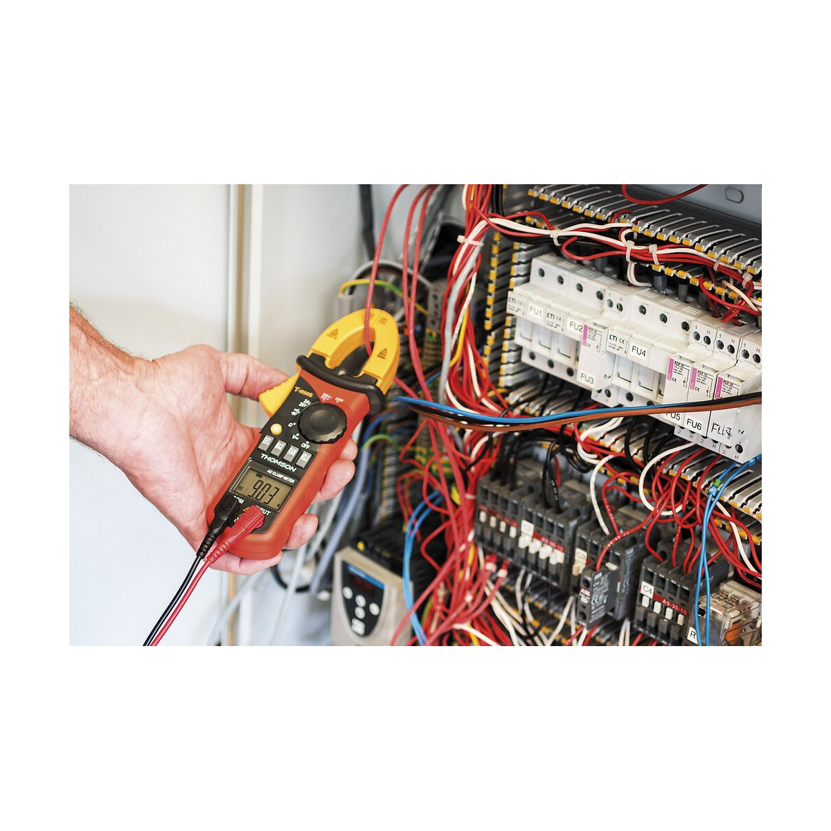 Pince ampèremétrique autocalibrée - 6 fonctions CAT III 600V - Thomson Mesurez et contrôlez vos installations en toute sécurité ! Cette pince ampèremétrique professionnelle CAT III avec écran LCD rétroéclairé dispose de 6 fonctions. Elle permet de mesurer une tension continue ou alternative jusqu'à 600V, un courant alternatif jusqu'à 600A et une résistance jusqu'à 200M ohms. Elle permet également de tester une diode et la continuité d'un courant. Sa fonction Hold permet de ne pas interrompre la mesure. Cette pince ampèremétrique est également dotée d'un indicateur de batterie faible et est livrée avec des pointes de test ainsi qu'une pochette de transport. 3 piles AAA 1,5V sont fournies. Certifié CE Caractéristiques: Fonction Hold Ecran LCD avec rétroéclairage Indicateur de batterie faible 3 Piles AAA 1,5V fournies 6 fonctions: Tension alternative Tension continue Courant alternatif Résistance Diode Continuité