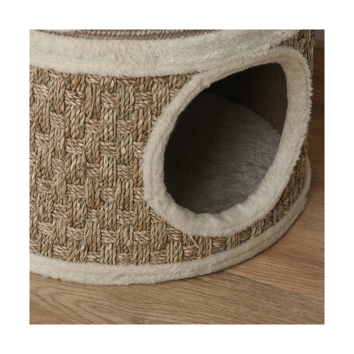 Cette tour à griffer pour chat recouverte de sisal naturel et de cordes d'algues sera certainement le jouet et habitat favori de votre chat ! C'est l'accessoire incroyable pour jouer, dormir et se cacher. Doté de 3 zones supérieures avec passage interne, votre chat aura 2 fois plus d'espace pour se déplacer et se cacher. La plateforme d'observation est recouverte de flanelle douce et confortable. Caractéristiques : - Tour à griffer pour chat entièrement recouverte de sisal naturel et de cordes d'algues - Intérieur doté de 3 niveaux connectées entre eux - 3 entrées niches idéales pour jouer et se cacher ou dormir - Plateforme d'observation recouverte de flanelle douce et confortable avec rebord - Equipement idéal pour que votre chat se retire au calme et fasse ses griffes - Structure robuste en panneaux de particules : usage quotidien pérenne Spécifications : - Couleur principale : beige - Matériaux principaux : panneaux de particules classe E1, peluche courte, sisal naturel, cordes d'algues, flanelle - Dim. totales : 37,5L x 37,5l x 70H cm - Dim. entrées : Ø 15,5 cm - Dim. passage interne : Ø 18 cm - Charge max. recommandée : 4 Kg - Livraison effectuée en un colis - Réf. : D30-326Spécifications techniques