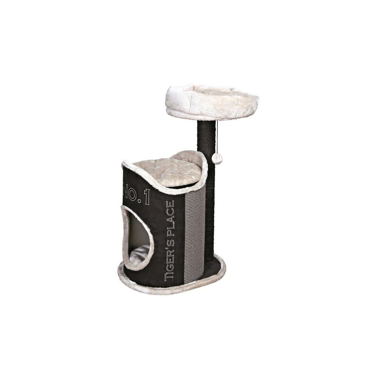 Arbre a chat en bois, tissu et métal - Recouvert de peluche - Poteau habillé de sisal naturel a griffer - Maison en aspect suédine - Avec coussins réversibles lavables a la main - Plateforme avec lit douillet amovible - Avec jouet suspendu a un fil - Emprise au sol : 54x44cm - Hauteur : 90cm - Coloris : noir et gris clair.Spécifications techniques