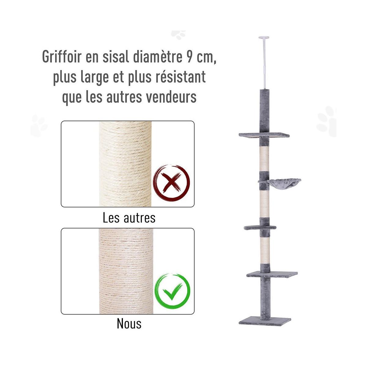 Votre boule de poils peut s'amuser tous les jours avec cet arbre à chat. Ce griffoir équipé de 5 niveaux de différentes tailles est le modèle idéal pour d'excellents moments d'amusement. Ce modèle haut de 2,3 à 2,6 mètres permet à votre petit compagnon de se dépenser ou de se faire les griffes sans avoir à s'attaquer à vos meubles. Grâce à sa conception avec des matières non toxiques, ce poteau à griffer est sans risque pour la santé de votre animal domestique. Caractéristiques : - Conçu avec de nombreuses plates-formes permettant à votre chat de disposer de beaucoup d'espace pour se détendre et jouer - Hauteur ajustable de 2,3 à 2,6 m et tige de traction fournie pour faciliter la fixation au plafond - Revêtement en peluche courte de 220 g/m,² pour une durabilité accrue - Idéal pour se faire les griffes - Conception résistante en panneaux de particules P2 - Monté sur un tube en papier de 9 cm de diamètre, pour une meilleure stabilité - A monter soi-même - Note : cet arbre de chat doit être fixé au plafond pour plus de sécurité. Conçu pour les plafonds faisant moins de 2,6 m de haut Spécifications : - Couleur : gris - Matière : panneau de particules P2, peluche courte, sisal - Dimensions totales : L40 x l 34 x H 230-260 cm - Dimensions 1er niveau (à partir du sol) : L 40 x l 34 cm - Dimensions 2ème niveau : L 40 x l 30 cm - Dimensions 3ème niveau : 30 cm - Dimensions 4ème niveau : 30cm - Dimensions 5ème niveau (par rapport au plafond) : L40 x l 30 cm - Charge maximale supportée: 15 kg - Charge maximale supportée à chaque plate-forme : 8 kg - Réf. : D30-209GYSpécifications techniques