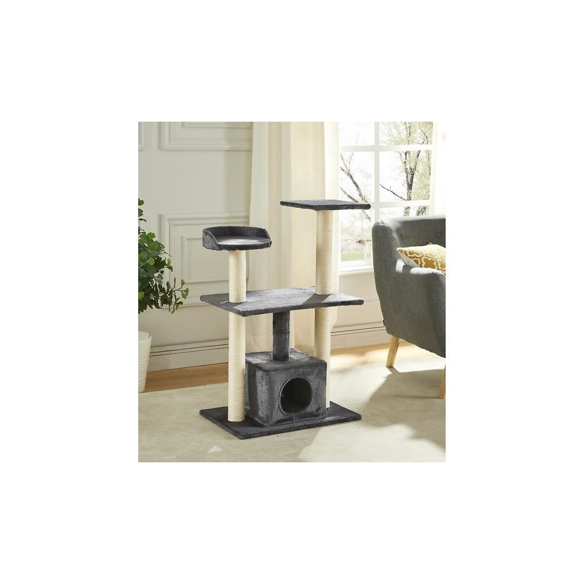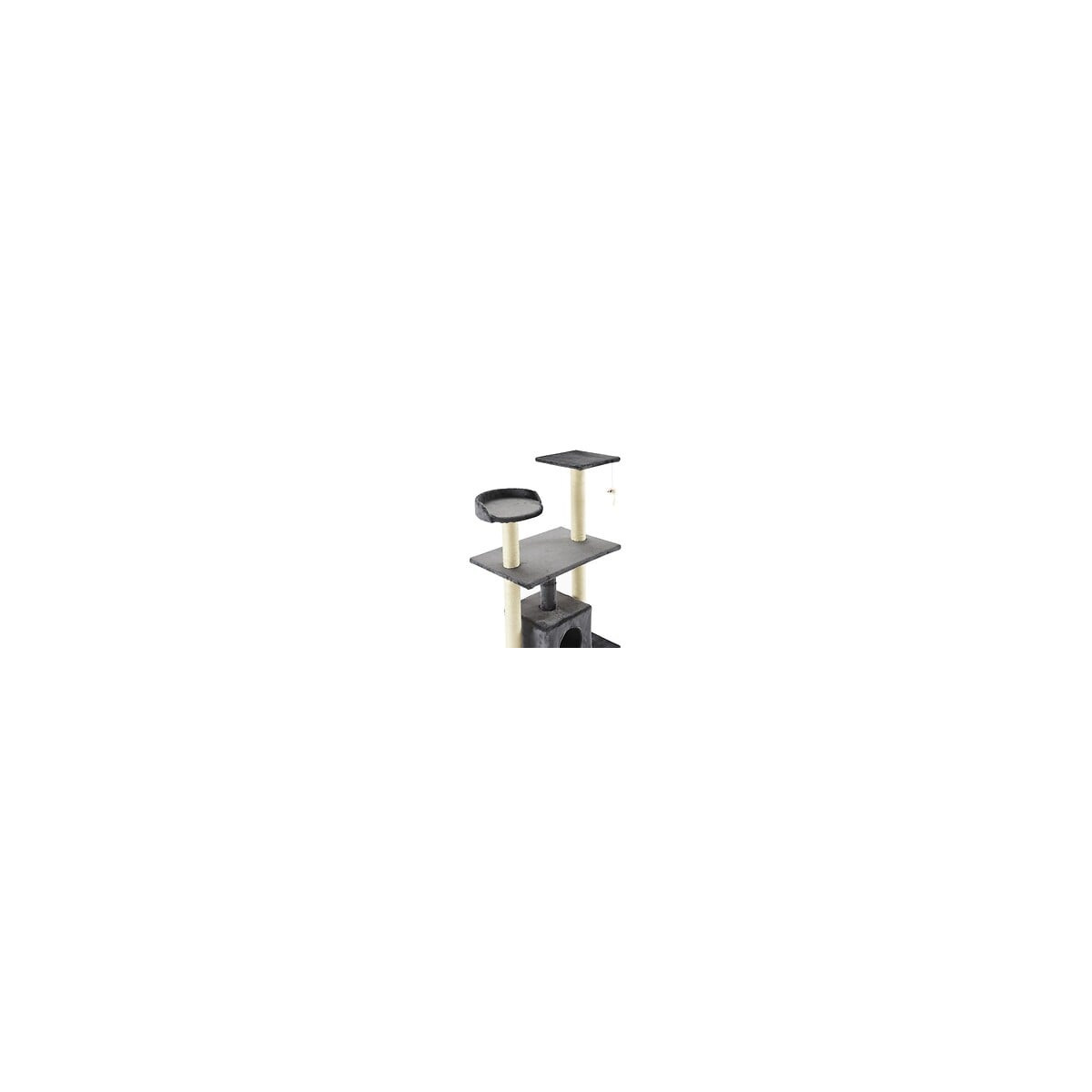 Arbre a chat - Structure en bois MDF, revetement peluche 400gsm, et fibre sisal 4mm - 2 perchoirs avec une figurine de jeu - Dimensions niche : 30x30x24cm - Dimensions base : 60x40cm - Coloris : gris.Spécifications techniques