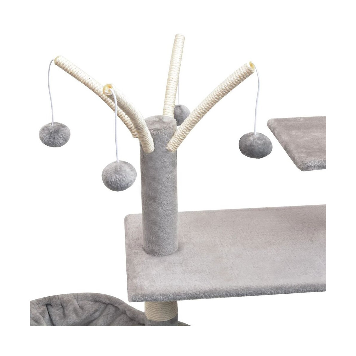 Offrez à vos amis félins un avant-goût du luxe avec notre arbre à chat rempli de fonctionnalités ! Ce centre de jeu à plusieurs étages, doté d'un cadre solide recouvert d'une peluche douce et confortable, est la retraite idéale où vos chats puissent se gratter, grimper, se percher, se cacher et se reposer. Vos amis félins peuvent aiguiser leurs griffes sur les griffoirs enroulés dans des cordes en sisal, qui fournit une bonne pratique pour leurs instincts à gratter. Ils aimeront également courir après l'autre tout en sautant de haut en bas dans ce centre de jeu amusant. Au sommet de l'arbre à chat, il y a des jouets suspendus qui vont éveiller vos chats curieux. Quand ils s'amusent suffisamment, vos petits amis adoreront se reposer sur les plates-formes supérieures, où ils auront une meilleure vue. Ils peuvent également se cacher dans la maison confortable pour faire une sieste, ou se détendre sur le hamac douillet. Avec toutes ces fonctionnalités amusantes, cet arbre à chat deviendra le lieu de prédilection de vos amis à fourrure ! Couleur : Gris Matériaux: structure en bois + corde sisal + peluche douce Dimensions totales : 96 x 35 x 125 cm (L x l x H) Dimensions de la maison : 30 x 25 cm (Diamètre x H) Diamètre du hamac : 30 cm Taille de la base : 60 x 35 cm (L x l) Avec maison, hamac, griffoirs, jouets et plateformes Matériel: Polyester: 100%Spécifications techniques