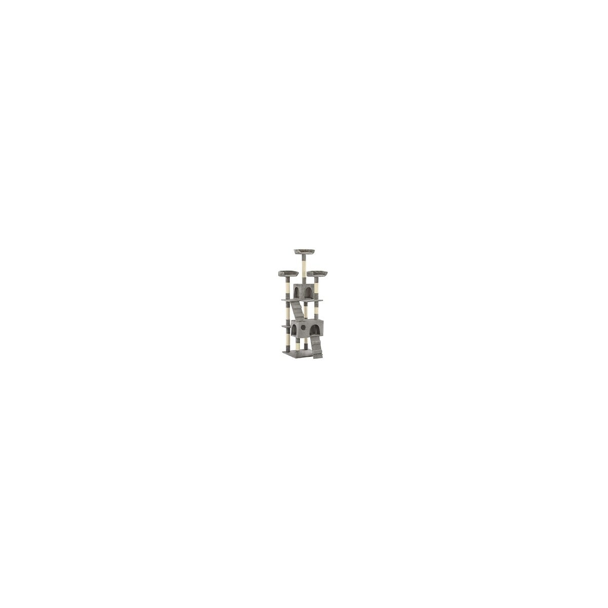 Donnez à vos amis félins le goût du luxe avec notre arbre à chat rempli de fonctionnalités ! Cette aire de jeu pour chats à plusieurs étages possède un cadre robuste recouvert de peluche douce et confortable et constitue le refuge parfait dans lequel vos chats peuvent se gratter, grimper, se percher, se cacher et se reposer. Vos amis félins peuvent aiguiser leurs griffes sur les poteaux à gratter enveloppés dans une corde de sisal, ce qui leur fournit un bon débouché pour leur instinct de gratter. Ils apprécieront également de se poursuivre en sautant dans ce centre de jeu amusant. Quand ils se seront suffisamment amusés, vos petits amis adoreront se reposer sur les plates-formes supérieures où ils auront une meilleure vue. Ils peuvent également se cacher dans les maisons confortables pour faire une sieste. Avec toutes ces fonctionnalités amusantes, cette tour pour chats deviendra le lieu de détente préféré de vos amis à quatre pattes ! L'arbre à chat est facile à assembler. Couleur : gris Matériau : cadre en panneau de particules + peluche douce + corde en sisal Dimensions totales : 50 x 50 x 170 cm (L x l x H) Dimensions de la maison (grande) : 45 x 27 x 25 cm (L x l x H) Dimensions de la maison (petite) : 27 x 27 x 25 cm (L x l x H) Diamètre du poteau : 7 cm Avec 2 maisons, 2 rampes, des plates-formes d'observation et des aires de détente Facile à assembler Matériel: Polyester: 100%Spécifications techniques