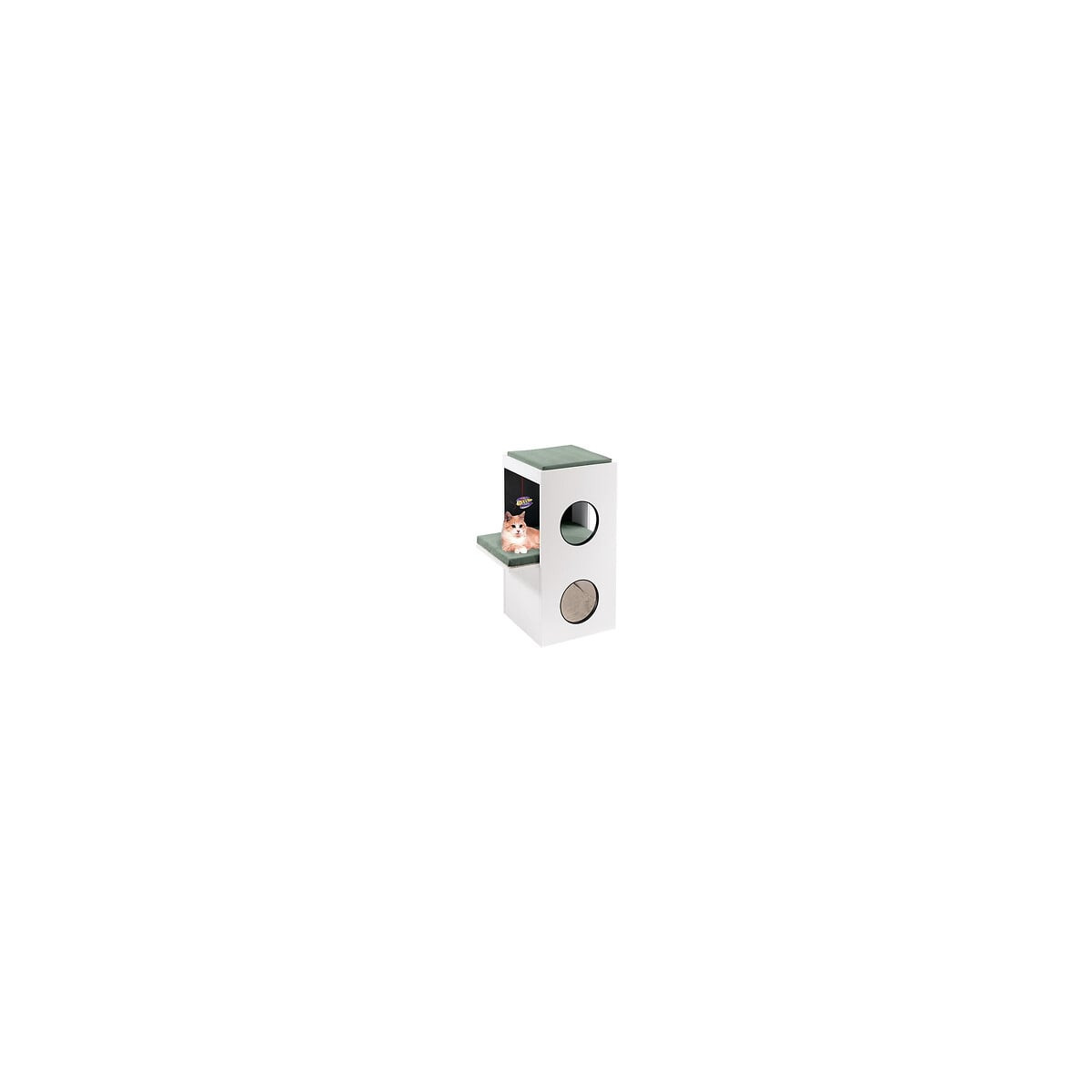 Arbre a chats bois, design italien recouvert de peinture. Structure verticale. A l'arriere se trouve un griffoir avec cadre en aluminium, dans la partie base votre chat disposera d'un abri confortable dans lequel il pourra se reposer. Les 2 étages sont équipés de coussins double-face et d'un jouet-balle.Spécifications techniques