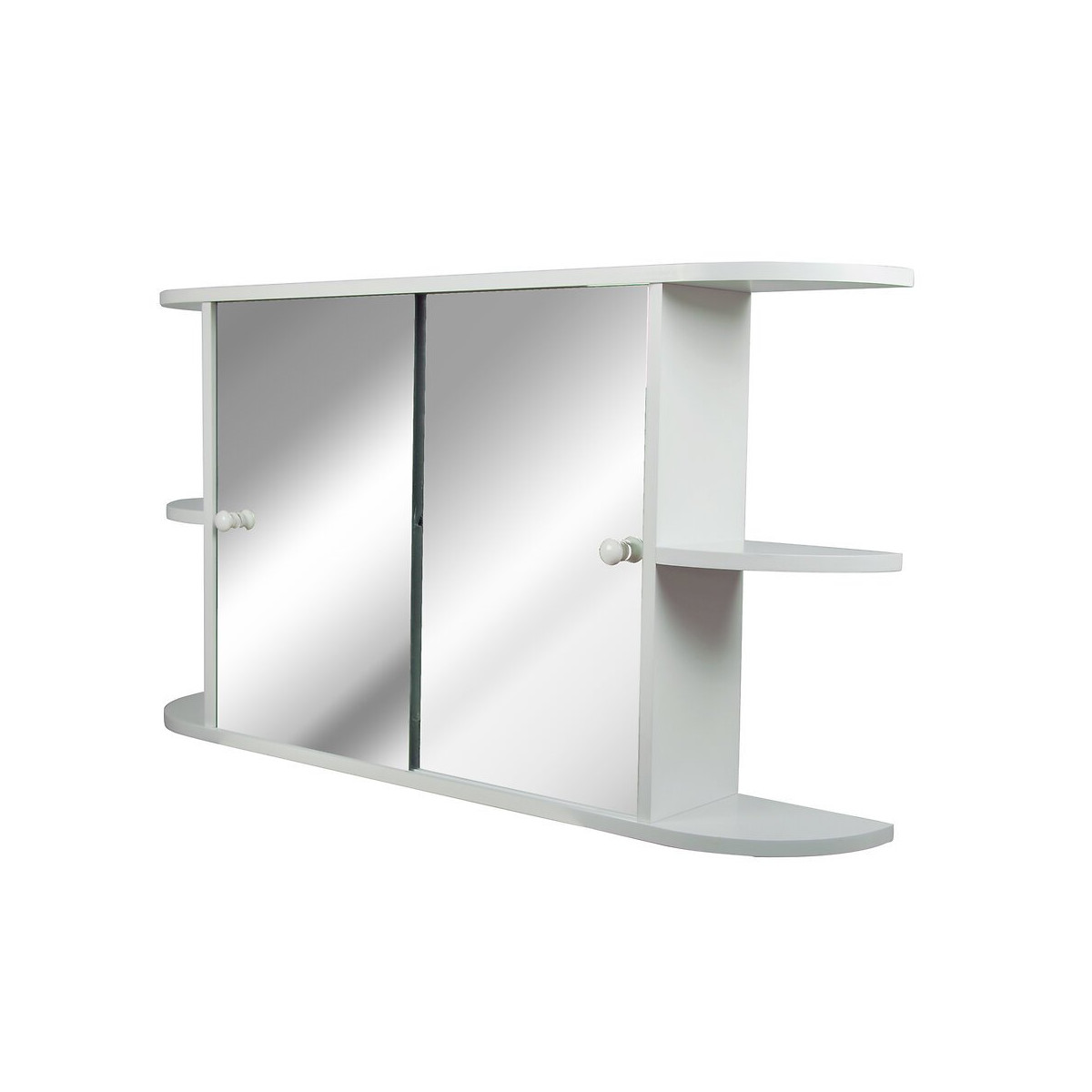 Armoire de toilette en kit. - MDF laqué blanc 15 mm. - 2 portes coulissantes, miroir argent, 4 mm bords polis avec boutons. - 1 tablette centrale en MDF 9 mm, réglable sur 3 niveaux. - 2 petites tablettes latérales apparentes. - Fixations fournies. - Vis.