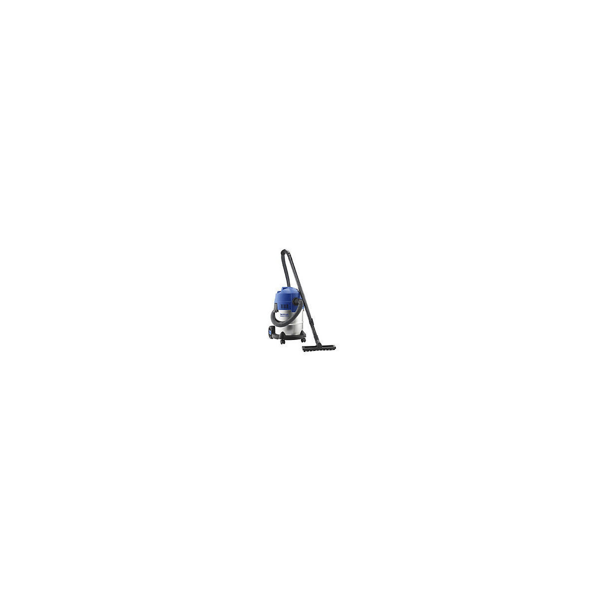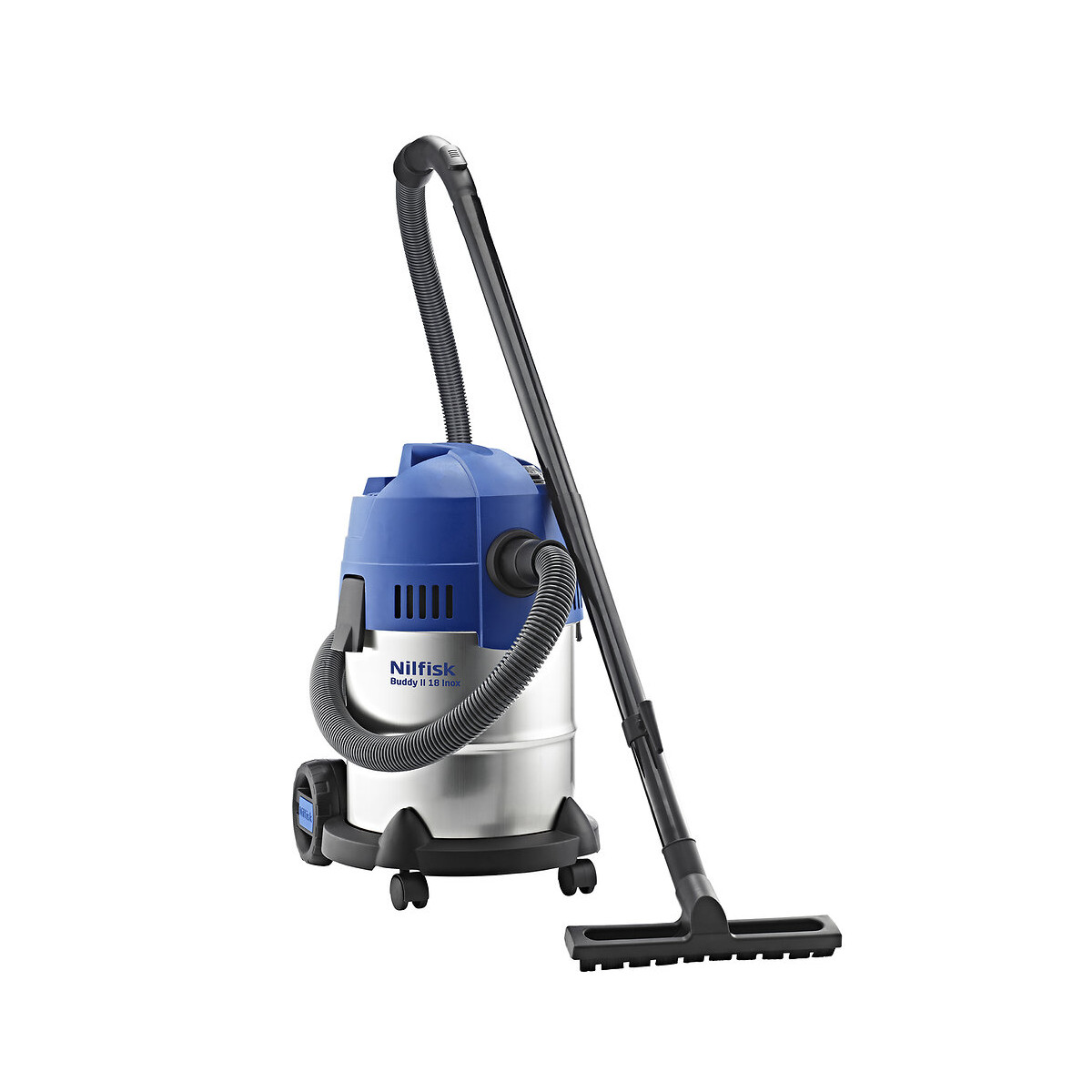 18451129 - Aspirateur eau et poussière BUDDY II 18 INOX Nilfisk 18451129. Doté d'un flexible 1,9 m avec poignée coudée (diamètre 36 mm) avec contrôle de la puissance d'aspiration. Grandes roues arrières et roues avants pivotantes pour faciliter tous les déplacements. - Type de produit : Aspirateur cuve. Matière cuve : Acier. Puissance :1200 W. Niveau sonore : 74 dB. Rayon d'action : 8 m. Capacité bac : 18 L. Dépression : 20 kpa. Réf.sac aspi. : 81943048. Filtre mixte eau et poussières lavable. Fonction soufflerie. 2 tubes rallonges plastique et tube plat biseauté. 2 accessoires inclus : brosse mixte et suceur biseauté. Rangement facile des accessoires. Large poignée facilitant le transport de l'appareil. Le + produit : Cuve inox. Longueur flexible : 1.9 m. Longueur câble électrique : 4 m. Coloris : Bleu, Noir et Inox. Dimensions : 36 x 33 x 53 cm. Poids net : 5,6 Kg.