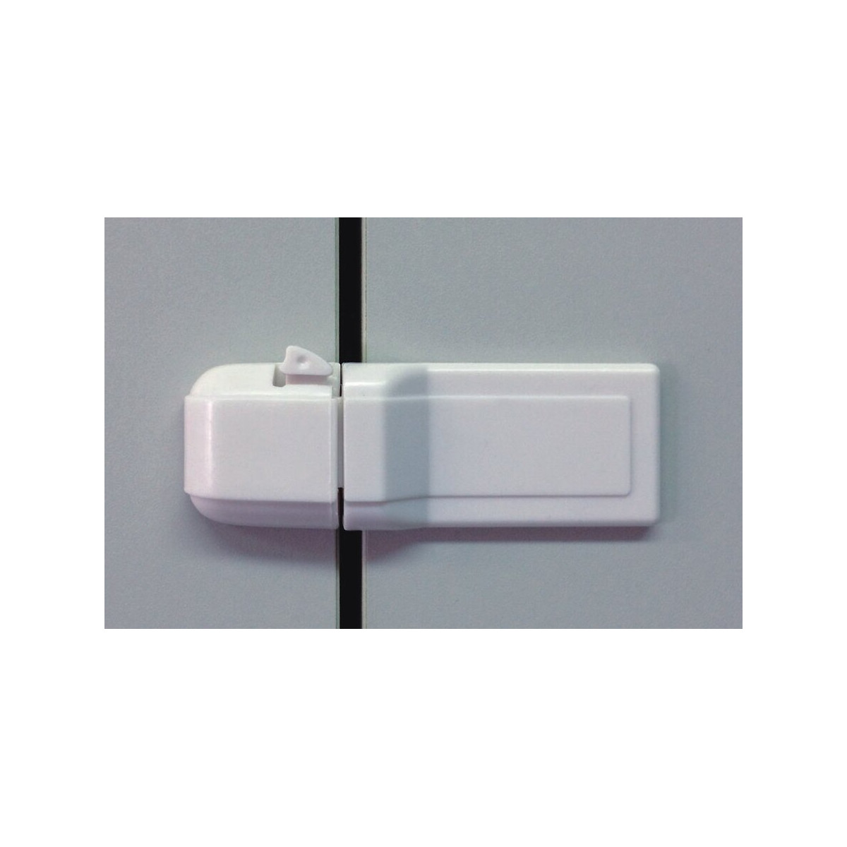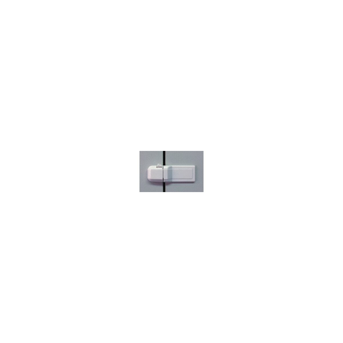 Bloque meuble adhésif coulissant en plastique blanc largeur 30 mm longueur 85 mm. Il empêche l'ouverture des portes.Spécifications techniques