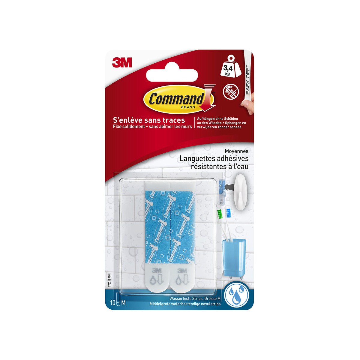 10 languettes de fixation adhésives enlevables résistantes à l'eau moyen modèle - Charge maximale supportée : 1.3 kg - Les languettes de fixation résistantes à l'eau Command™ permettent de déplacer et de raccrocher facilement vos produits Command™ et objets/accessoires pour les changements de décoration, la réorganisation ou lors d'un déménagement. Ces languettes peuvent être utilisées comme recharge pour les crochets Command™ ou pour accrocher des objets plats avec une profondeur maximale de 2cm. Comme tous les produits Command™, elles s'accrochent solidement sur différentes surfaces, notamment les surfaces carrelées, en bois, en métal et peintes. De plus, elles s'enlèvent proprement en ne laissant ni trou, ni marque, ni résidu collant. Les languettes Command™ existent en petit et grand format. Elles sont aussi idéales pour remplacer le ruban adhésif double-face. Elles se fixent solidement et se retirent sans laisser de trace.Spécifications techniques