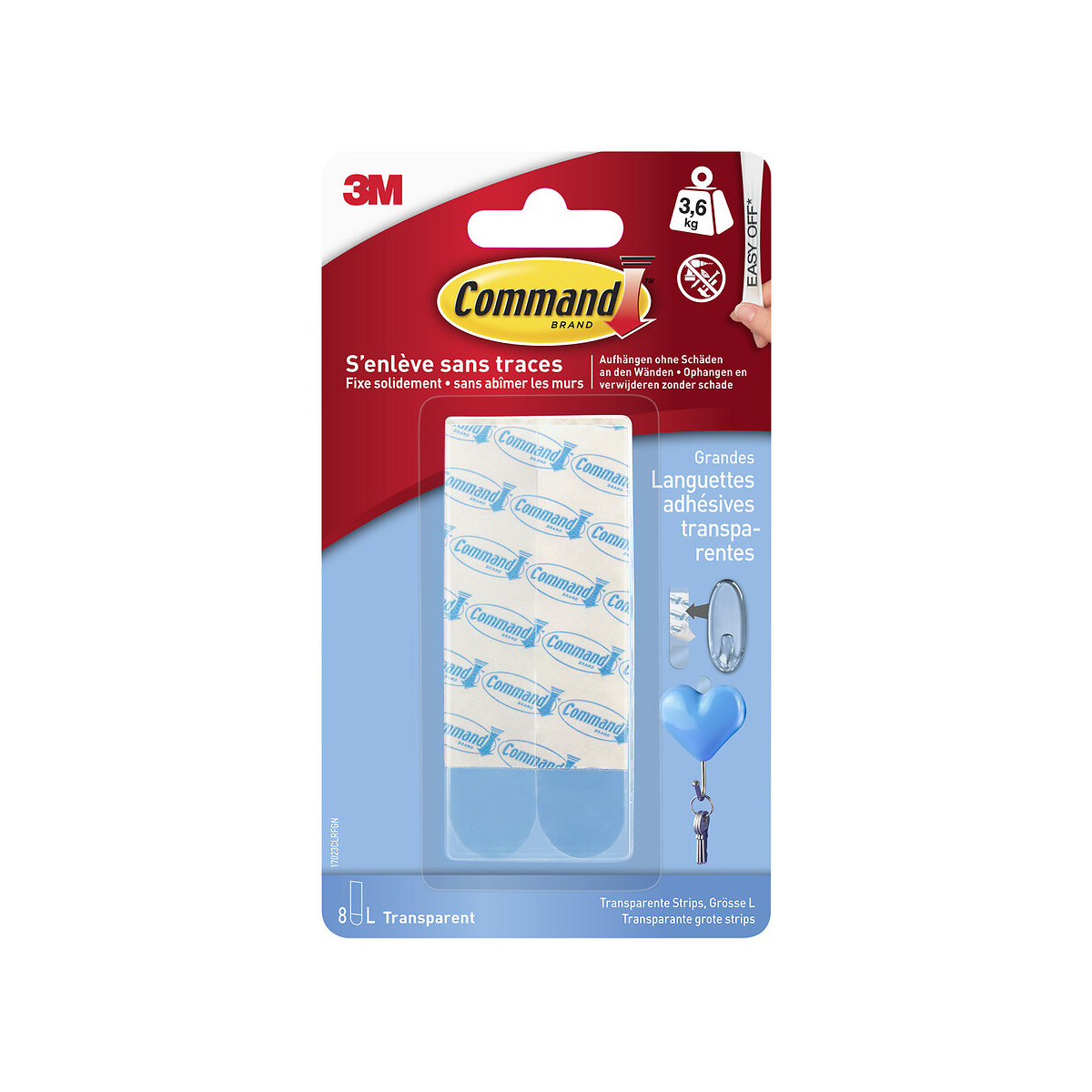 8 languettes de fixation adhésives enlevables transparentes grand modèle - Charge maximale supportée : 1.8 kg - Les languettes de fixation transparentes Command™ permettent de déplacer et de raccrocher facilement vos produits Command™ et objets/accessoires pour les changements de décoration, la réorganisation ou lors d'un déménagement. Ces languettes peuvent être utilisées comme recharge pour les crochets Command™ ou pour accrocher des objets plats avec une profondeur maximale de 2cm. Comme tous les produits Command™, elles s'accrochent solidement sur différentes surfaces, notamment les surfaces carrelées, en bois, en métal et peintes. De plus, elles s'enlèvent proprement en ne laissant ni trou, ni marque, ni résidu collant. Les languettes transparentes Command™ existent en petit et moyen format. Elles sont aussi idéales pour remplacer le ruban adhésif double-face. Elles se fixent solidement et se retirent sans laisser de trace.Spécifications techniques