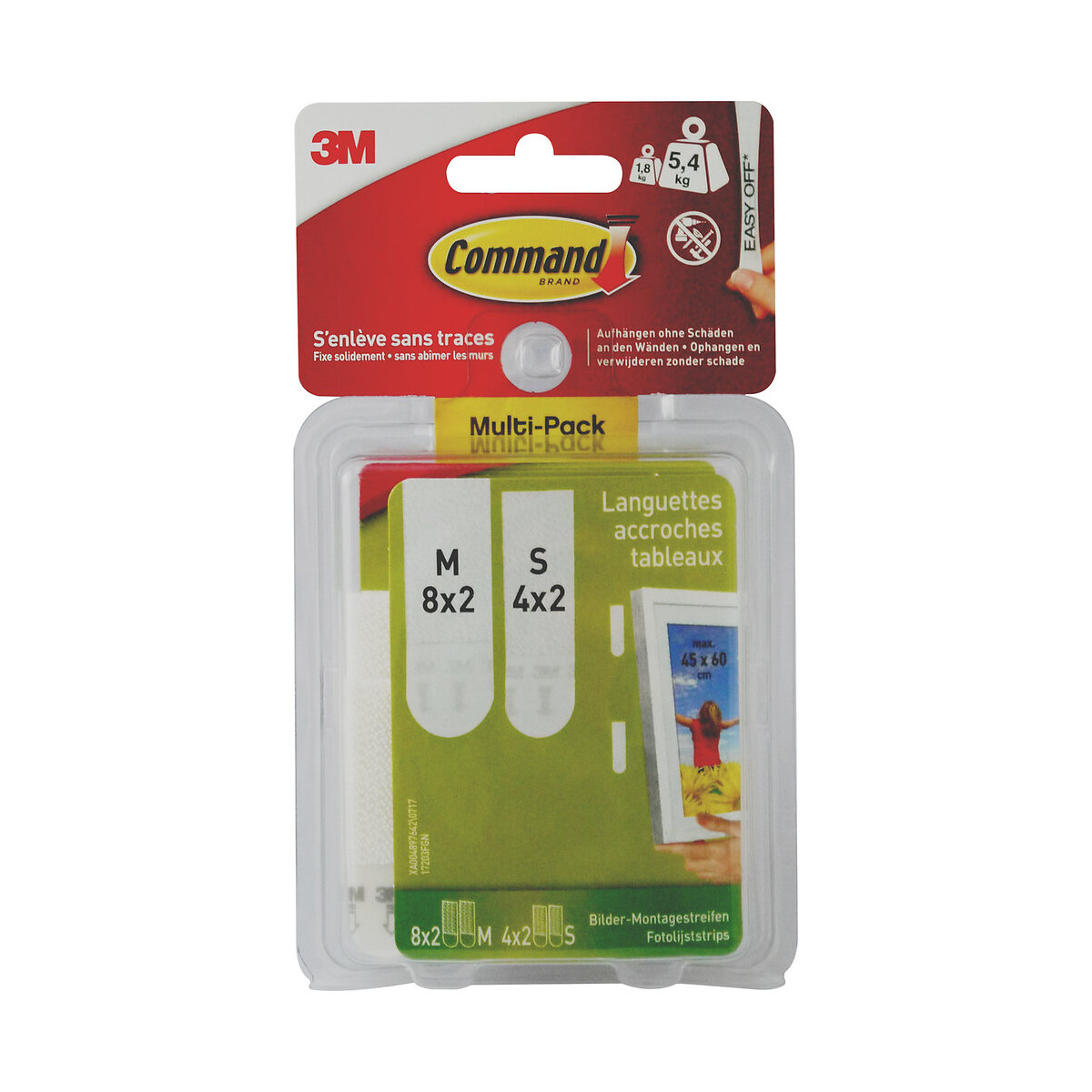 Assortiment de 4 paires de 2 languettes de fixation adhésives enlevables tableau petit modèle blanc - charge maximale supportée : 1.8 kg + 8 paires de 2 languettes de fixation adhésives enlevables tableau moyen modèle blanc - charge maximale supportée : 5.4 kg - Avec la technologie Command™, oubliez les clous, vis, punaises qui abîment les murs ! Les languettes adhésives Accroches Tableaux Command™ permettent de fixer les cadres, simplement et solidement, sans outil, sans trou et sans trace. De plus, elles permettent la fixation des tableaux sur de nombreux supports (carrelage, murs peints, mélaminé, inox ...). Le système de fermeture en picots Command™ permet de fixer solidement mais aussi de décrocher et repositionner les cadres à volonté, favorisant selon vos envies et besoins une décoration nomade et ludique. Lorsque vous êtes prêts à retirer ou déplacer vos tableaux, elles se retirent proprement , pas de trous, de marques ou de résidus collants.Spécifications techniques