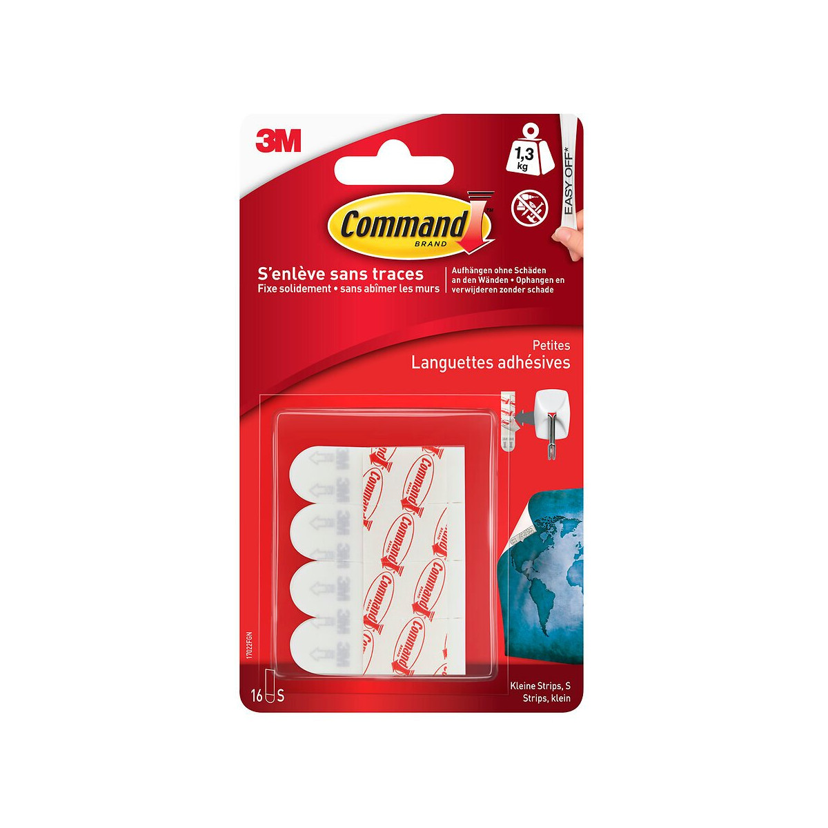 16 languettes de fixation adhésives enlevables standard petit modèle blanc - Charge maximale supportée : 450g - Les languettes de fixation Command™ permettent de déplacer et de raccrocher facilement vos produits Command™ et objets/accessoires pour les changements de décoration, la réorganisation ou lors d'un déménagement. Ces languettes peuvent être utilisées comme recharge pour les crochets Command™ ou pour accrocher des objets plats avec une profondeur maximale de 2cm. Comme tous les produits Command™, elles s'accrochent solidement sur différentes surfaces, notamment les surfaces carrelées, en bois, en métal et peintes. De plus, elles s'enlèvent proprement en ne laissant ni trou, ni marque, ni résidu collant. Elles sont aussi idéales pour remplacer le ruban adhésif double-face. Elles se fixent solidement et se retirent sans laisser de trace.Spécifications techniques