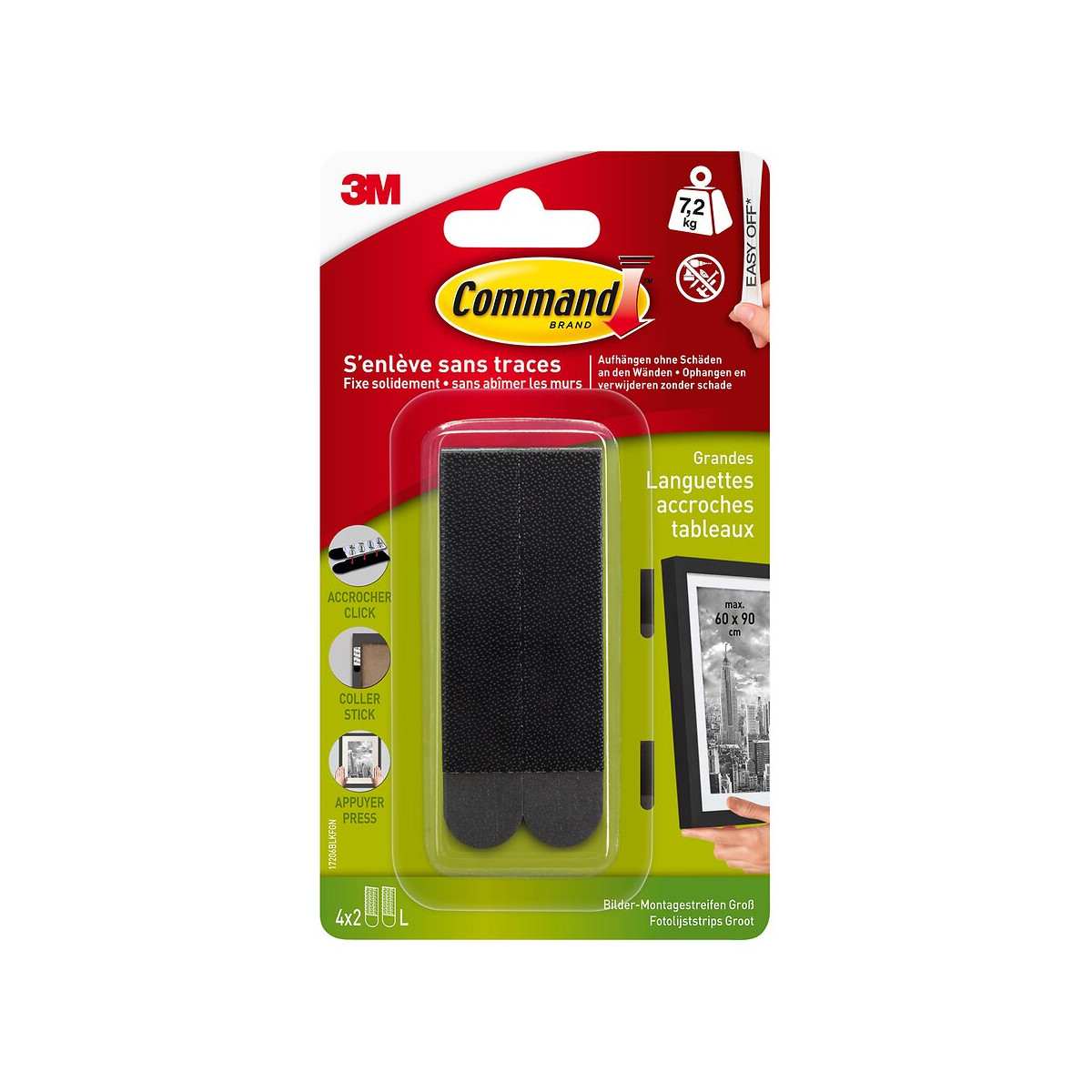 4 paires de 2 languettes de fixation adhésives enlevables tableau grand modèle noir - Charge maximale supportée : 7.2 kg - Avec la technologie Command™, oubliez les clous, vis, punaises qui abîment les murs ! Les languettes adhésives Accroches Tableaux Command™ permettent de fixer les cadres, simplement et solidement, sans outil, sans trou et sans trace. De plus, elles permettent la fixation des tableaux sur de nombreux supports (carrelage, murs peints, mélaminé, inox ...). Le système de fermeture en picots Command™ permet de fixer solidement mais aussi de décrocher et repositionner les cadres à volonté, favorisant selon vos envies et besoins une décoration nomade et ludique. Lorsque vous êtes prêts à retirer ou déplacer vos tableaux, elles se retirent proprement , pas de trous, de marques ou de résidus collants.Spécifications techniques