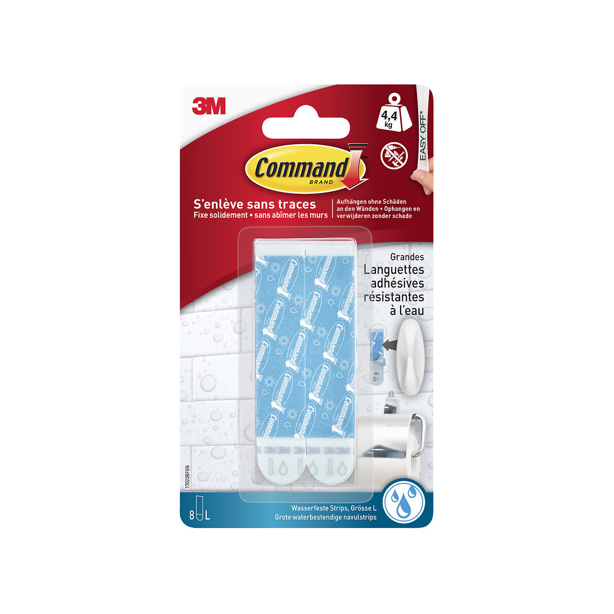 8 languettes de fixation adhésives enlevables résistantes à l'eau petit modèle - Charge maximale supportée : 2,2 kg - Les languettes de fixation résistantes à l'eau Command™ permettent de déplacer et de raccrocher facilement vos produits Command™ et objets/accessoires pour les changements de décoration, la réorganisation ou lors d'un déménagement. Ces languettes peuvent être utilisées comme recharge pour les crochets Command™ ou pour accrocher des objets plats avec une profondeur maximale de 2cm. Comme tous les produits Command™, elles s'accrochent solidement sur différentes surfaces, notamment les surfaces carrelées, en bois, en métal et peintes. De plus, elles s'enlèvent proprement en ne laissant ni trou, ni marque, ni résidu collant. Les languettes Command™ existent en petit et grand format. Elles sont aussi idéales pour remplacer le ruban adhésif double-face. Elles se fixent solidement et se retirent sans laisser de trace.Spécifications techniques
