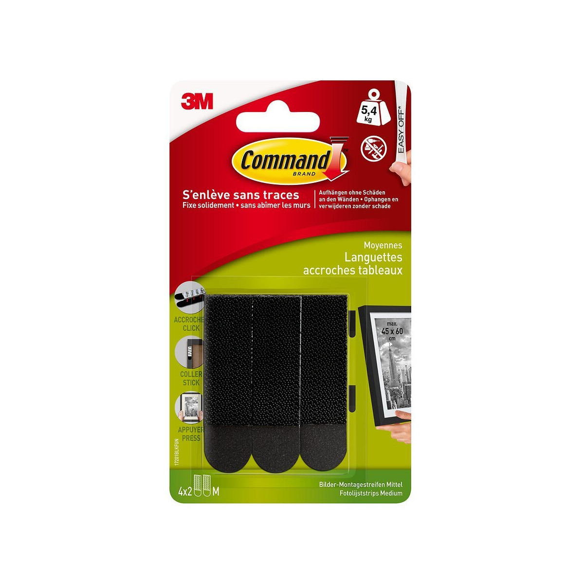 4 paires de 2 languettes de fixation adhésives enlevables tableau moyen modèle noir - Charge maximale supportée : 5,4 kg - Avec la technologie Command™, oubliez les clous, vis, punaises qui abîment les murs ! Les languettes adhésives Accroches Tableaux Command™ permettent de fixer les cadres, simplement et solidement, sans outil, sans trou et sans trace. De plus, elles permettent la fixation des tableaux sur de nombreux supports (carrelage, murs peints, mélaminé, inox ...). Le système de fermeture en picots Command™ permet de fixer solidement mais aussi de décrocher et repositionner les cadres à volonté, favorisant selon vos envies et besoins une décoration nomade et ludique. Lorsque vous êtes prêts à retirer ou déplacer vos tableaux, elles se retirent proprement , pas de trous, de marques ou de résidus collants.Spécifications techniques